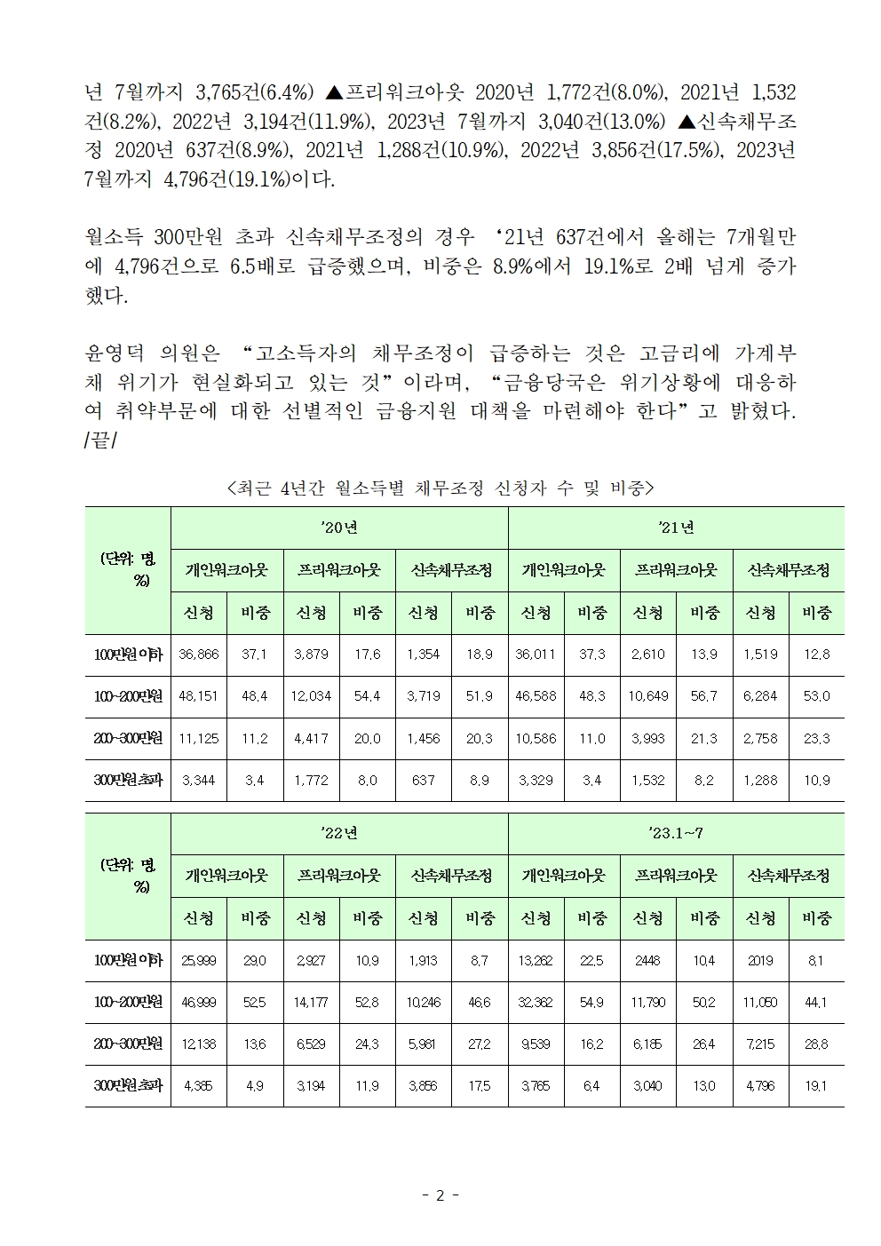 [윤영덕의원 국감 보도자료]고금리에 가계부채 위기! 월소득 300만원 이상 채무조정 신청자 급증!