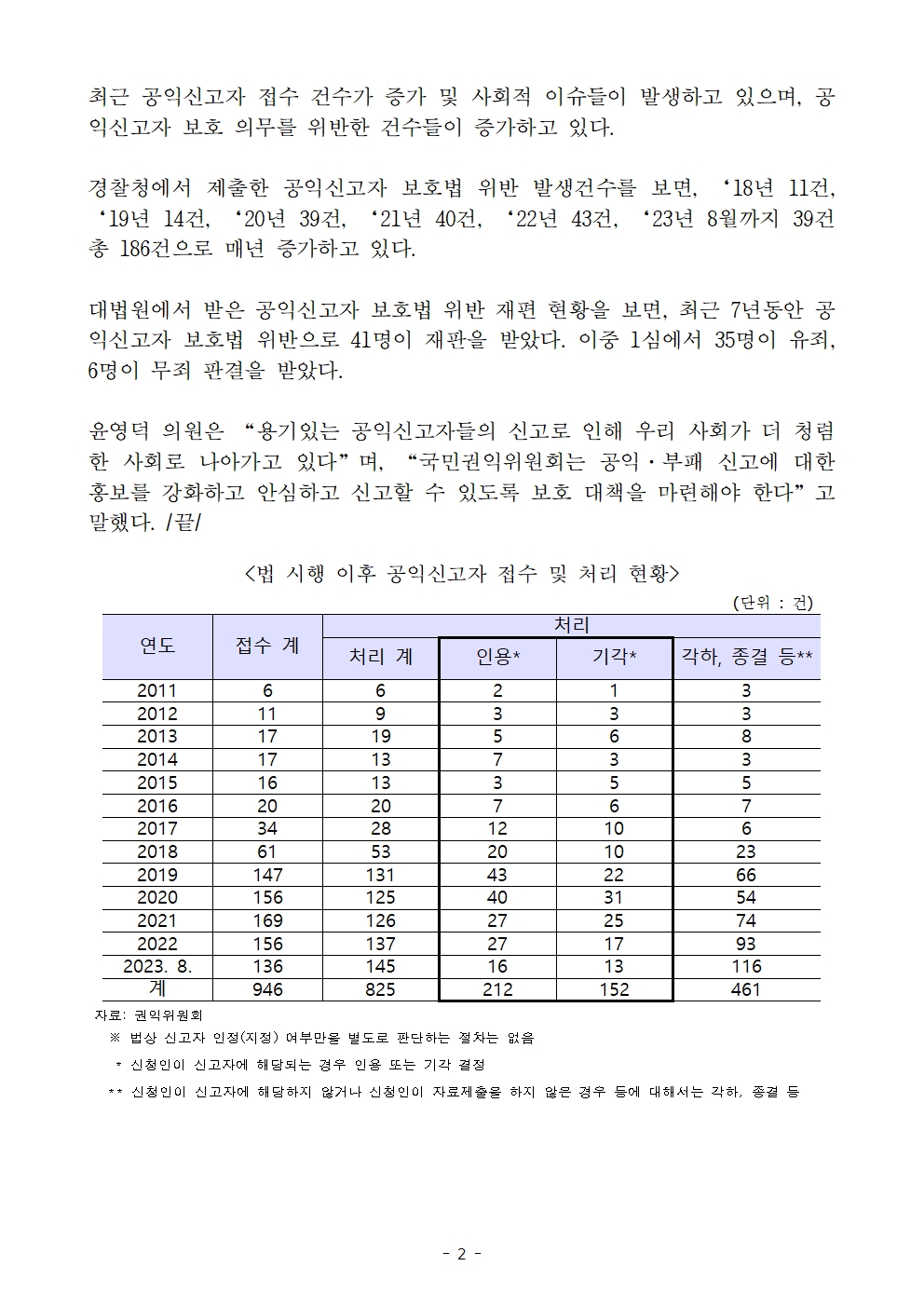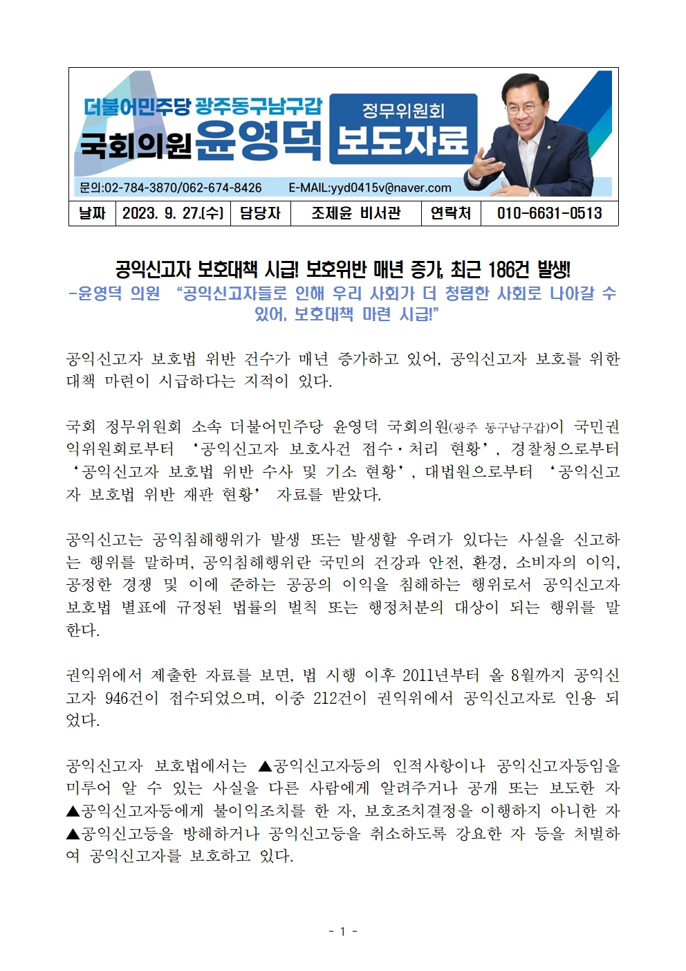 230927_윤영덕_보도자료_공익신고자 보호대책 시급 보호위반 매년 증가_ 186건 발생.hwp