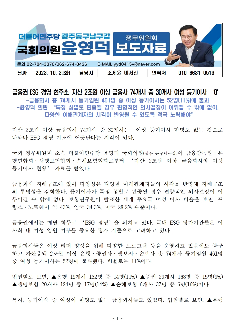 231003_윤영덕_보도자료_금융권 ESG 경영 현주소_ 자산 2조원 이상 금융회사 74곳 중 30곳에서는 여성 등기이사 0.hwp