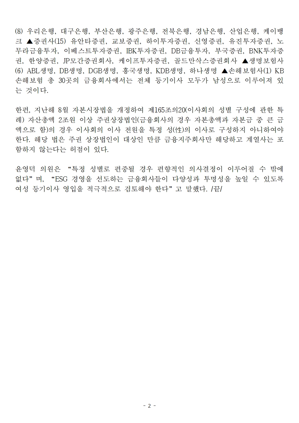 [윤영덕의원 국감 보도자료]금융권 ESG 경영 현주소, 자산 2조원 이상 금융사 74개사 중 30개사 여성 등기이사 ‘0’
