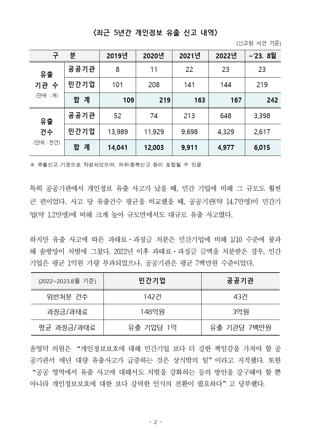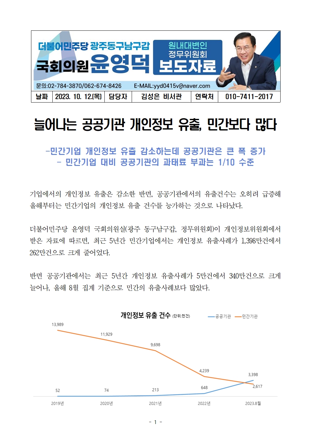 [윤영덕의원 국감 보도자료]늘어나는 공공기관 개인정보 유출, 민간보다 많다