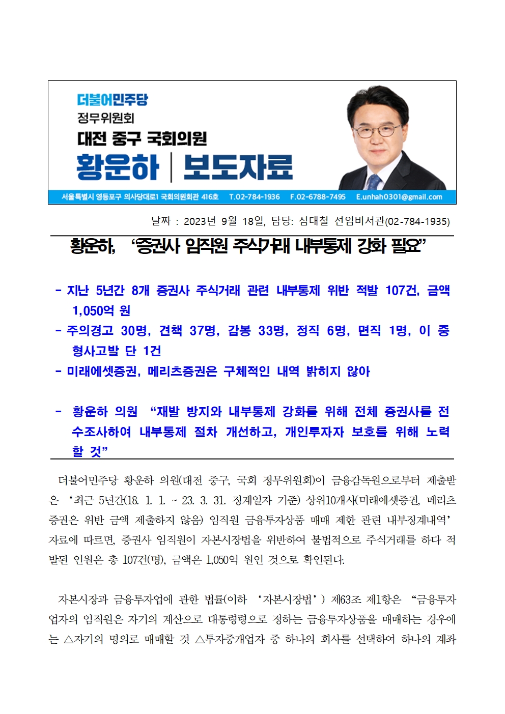[황운하의원 보도자료] 증권사 임직원 주식거래 내부통제 강화 필요