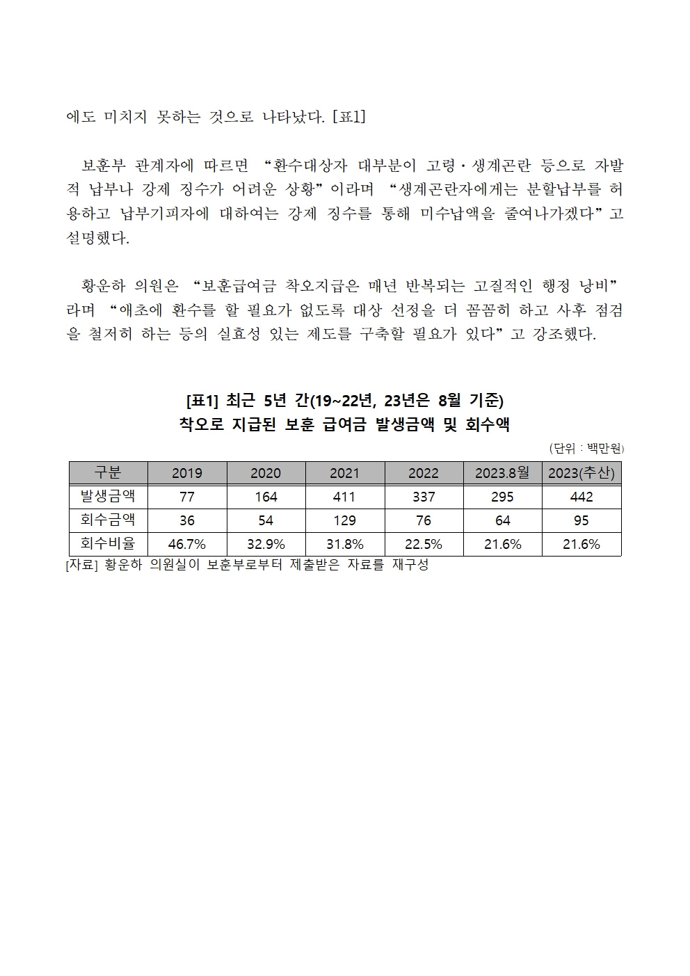 [황운하의원 보도자료] 매년 줄지 않는 착오지급 보훈급여금 회수율은 절반이나 하락…19년 46.7%→23년 21.6%