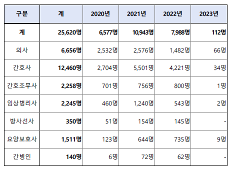 ▴2020~23.6, 코로나19 대응위해 투입된 전문 의료인력 총2만5천여명