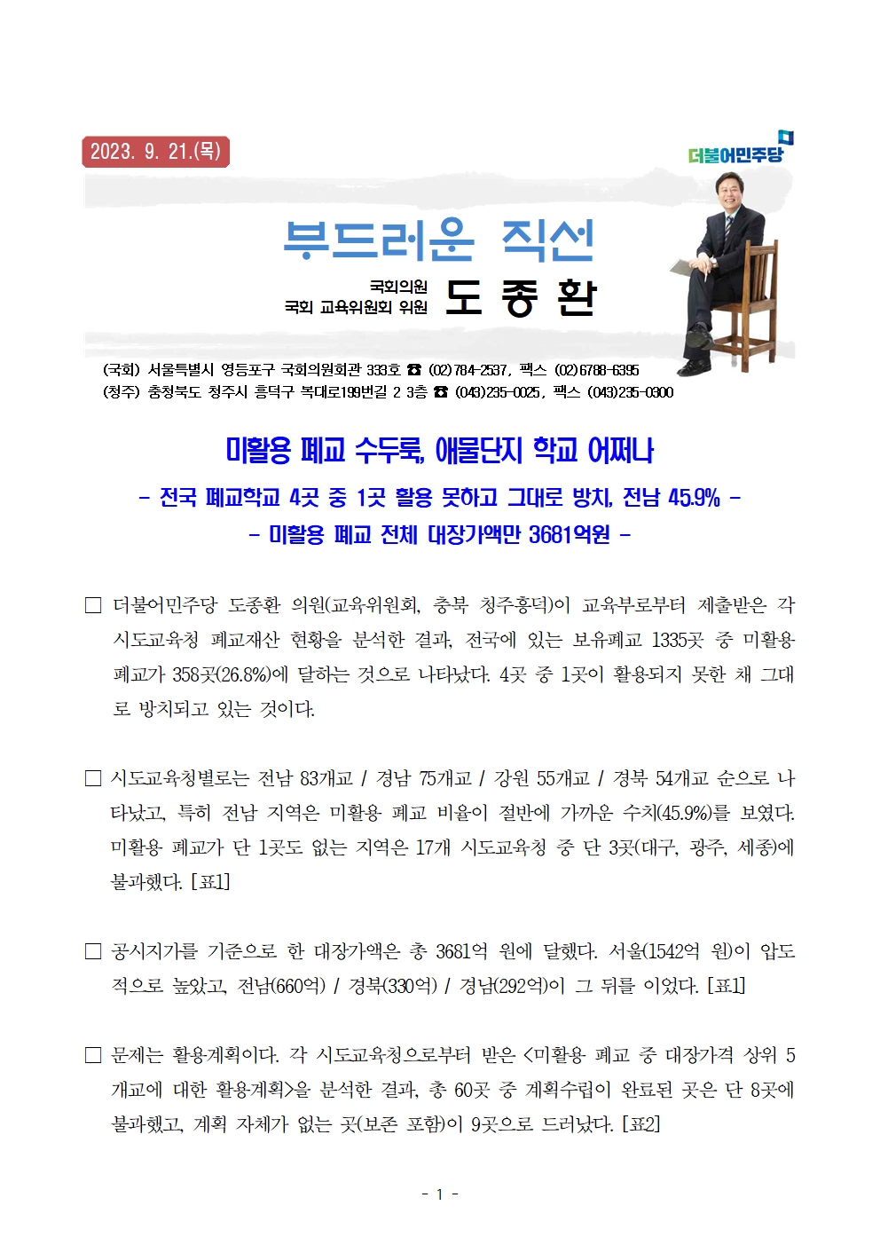 230921 [도종환의원 보도자료] 미활용폐교 수두룩 애물단지 학교 어쩌나.hwp