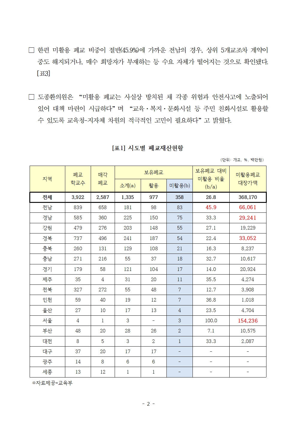 [도종환의원 보도자료] 미활용폐교 수두룩, 애물단지 학교 어쩌나