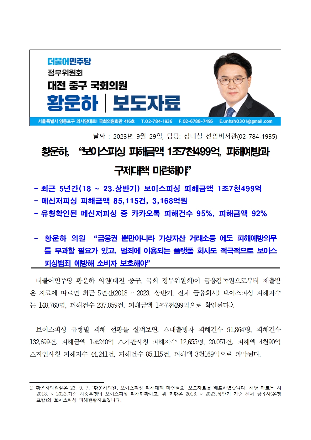 [황운하의원 보도자료] 보이스피싱 피해금액 1조7천499억, 피해예방과 구제대책 마련해야