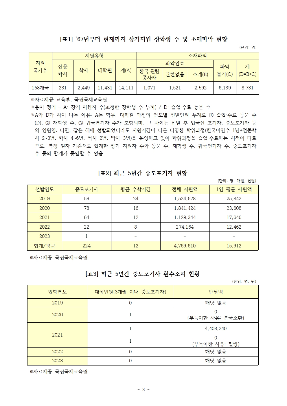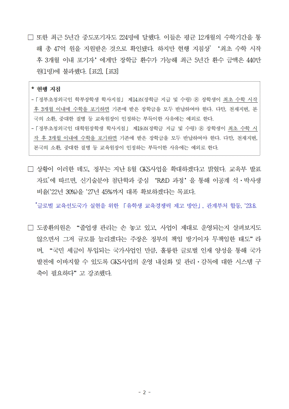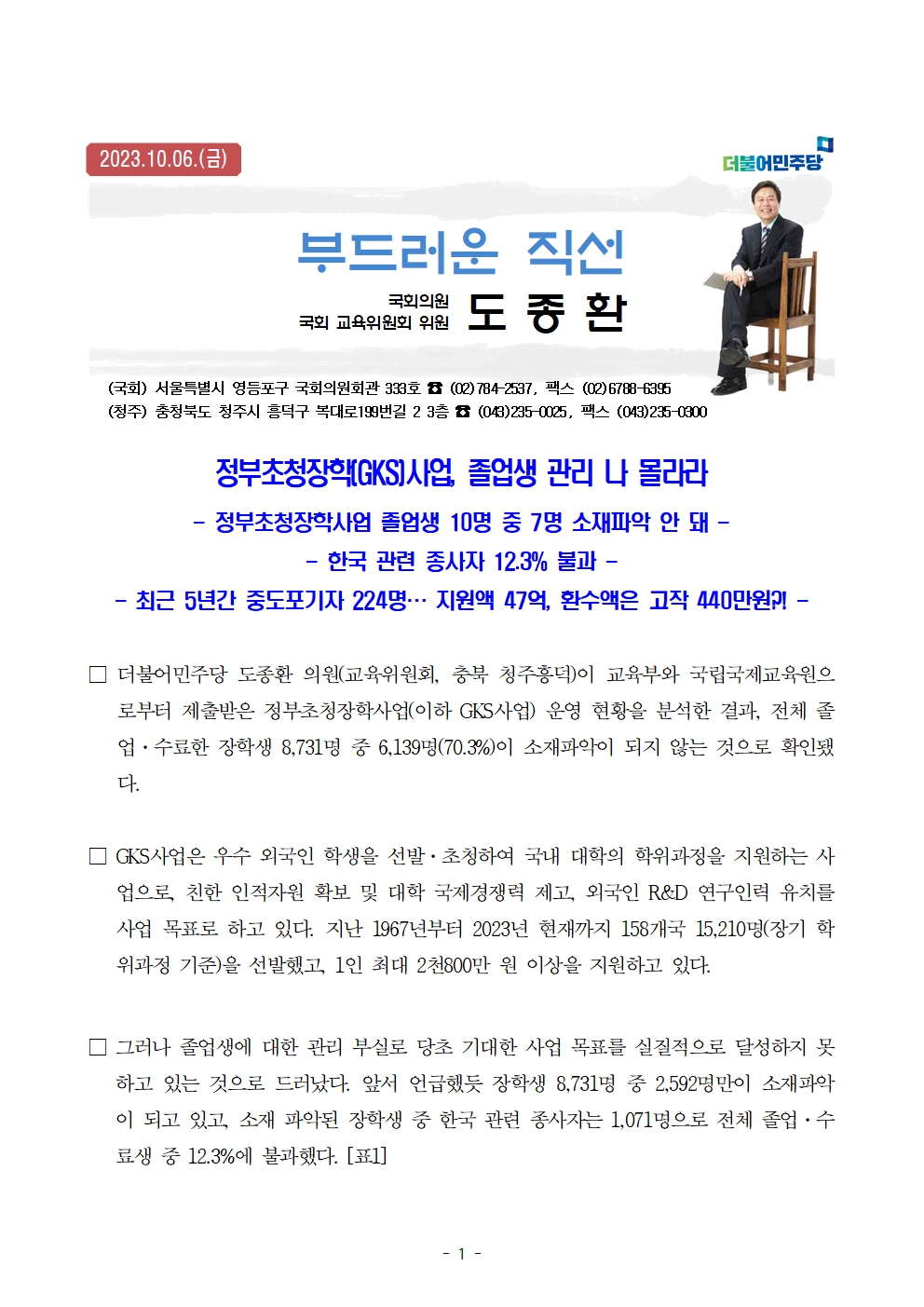 [도종환의원 보도자료] 정부초청장학(GKS)사업, 졸업생 관리 나 몰라라
