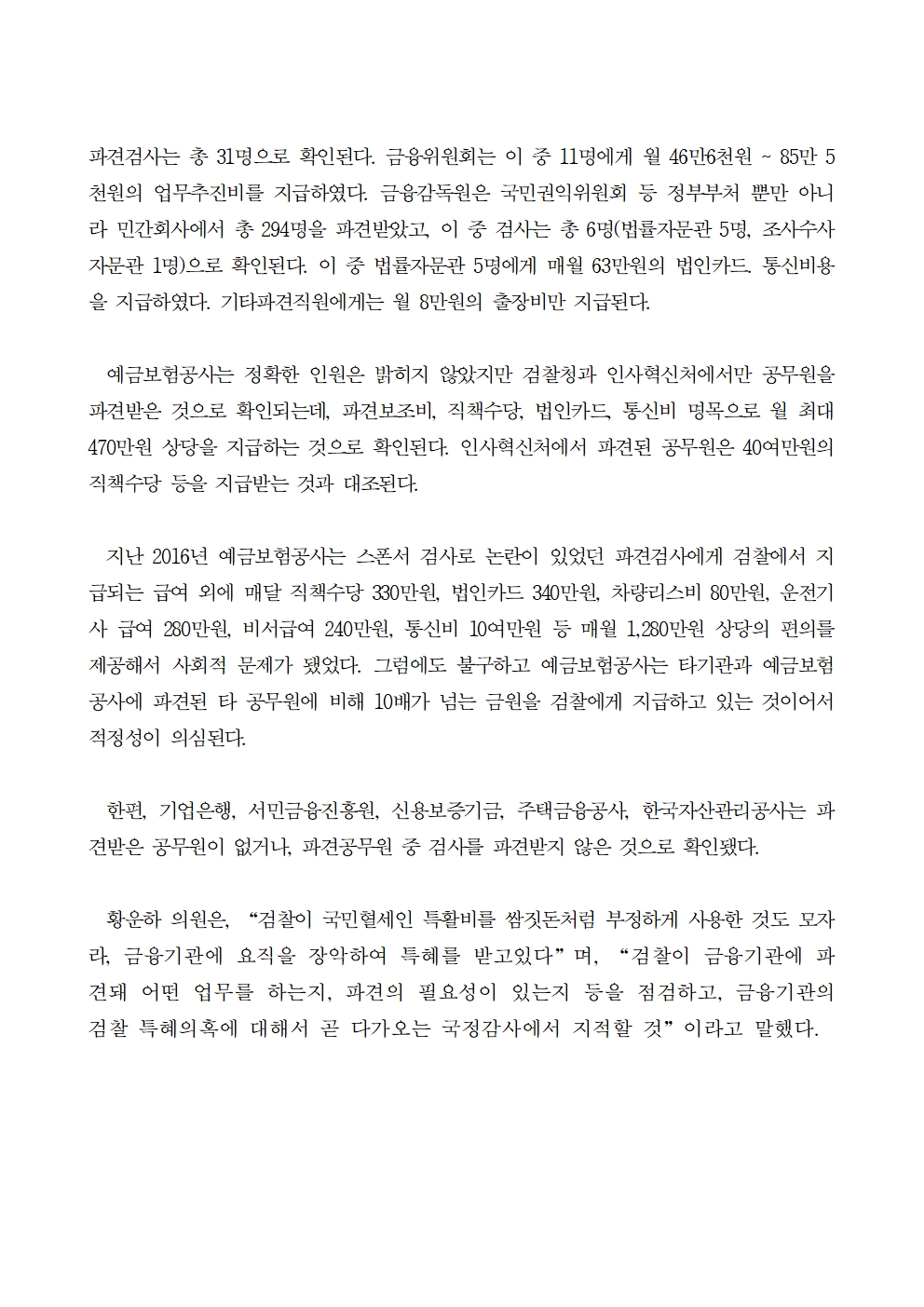 [황운하의원 보도자료] 제2의 검찰 특수활동비, 금융기관 검사 파견 특혜 제공 폐지해야