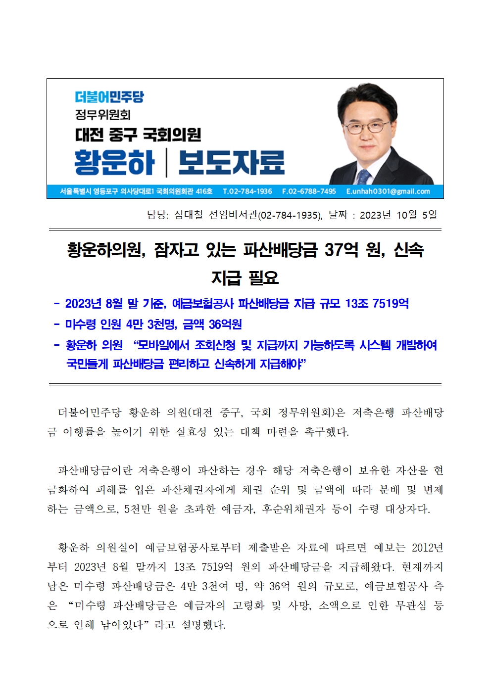[황운하의원 보도자료] 잠자고 있는 파산배당금 37억 원, 신속 지급 필요