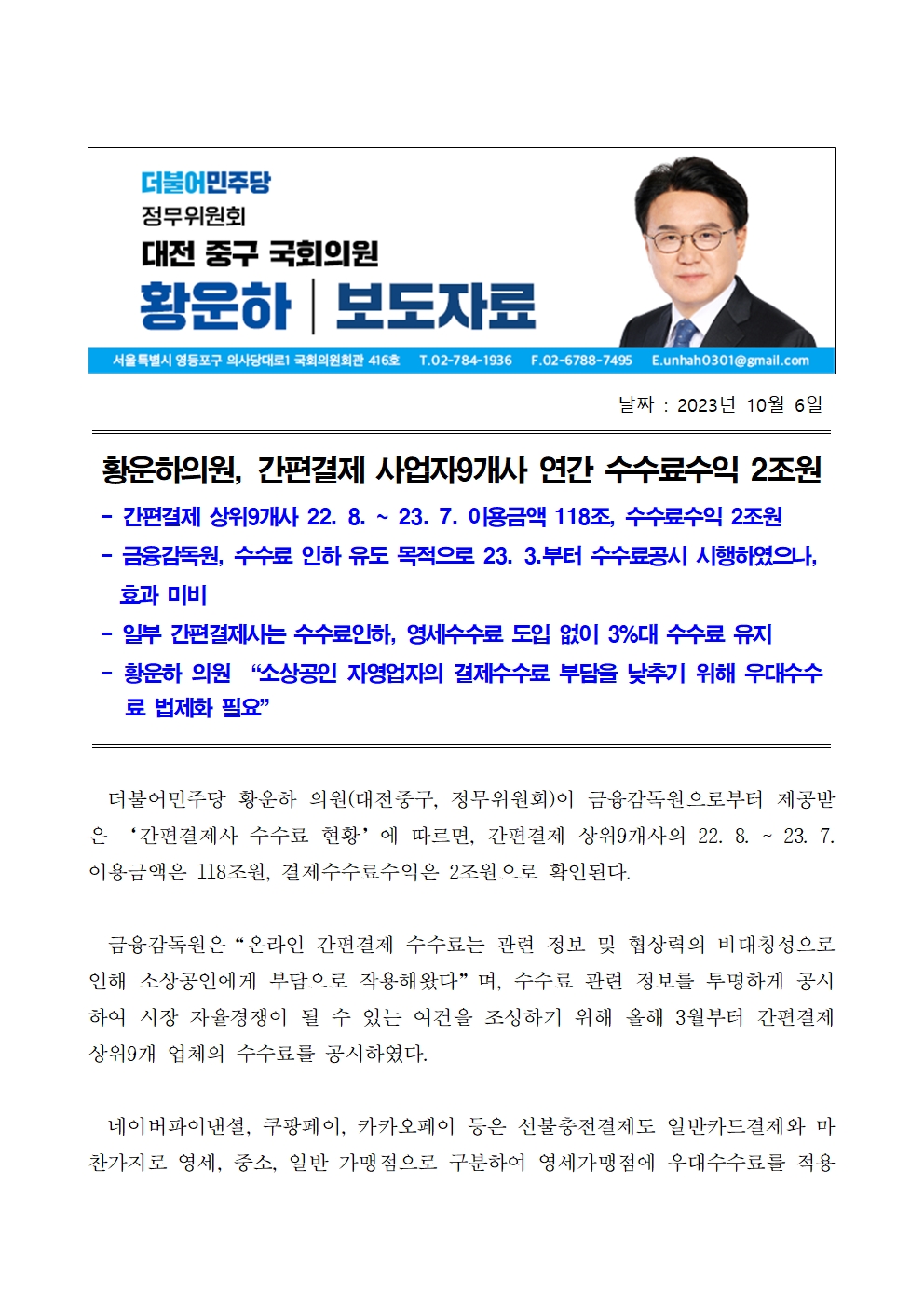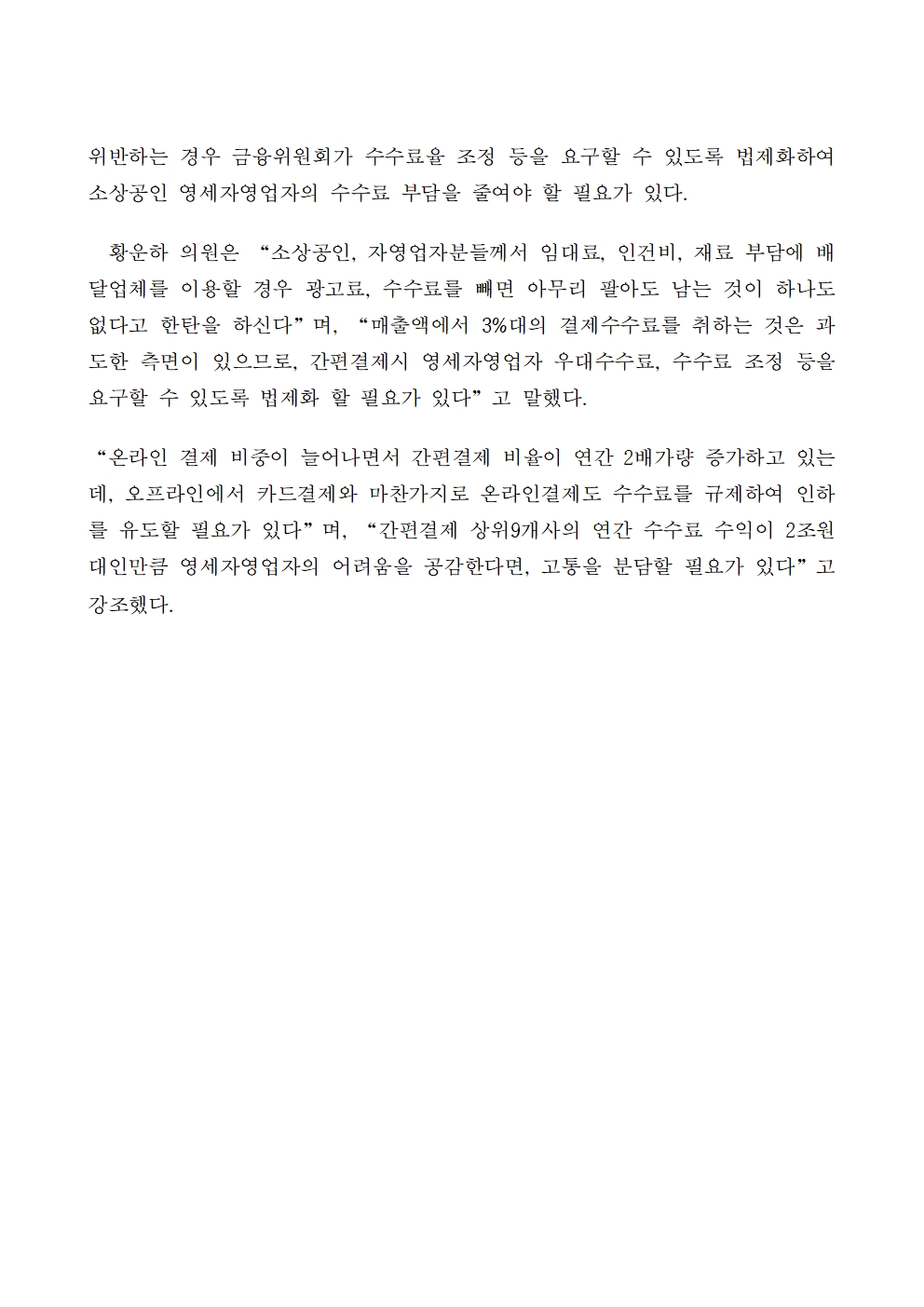 [황운하의원 보도자료] 간편결제 사업자9개사 연간 수수료수익 2조원