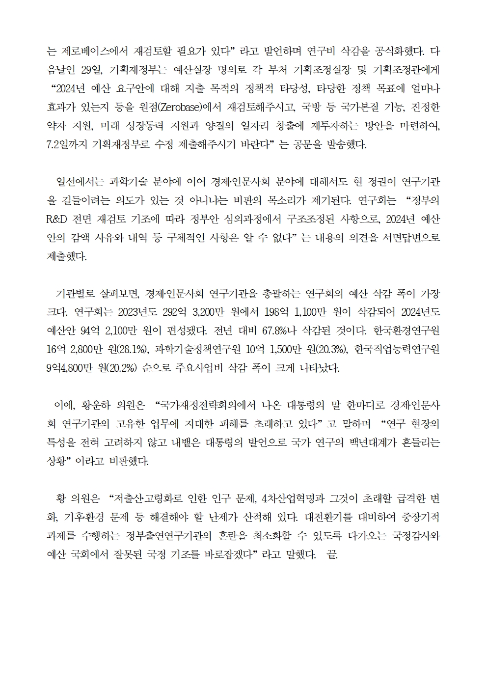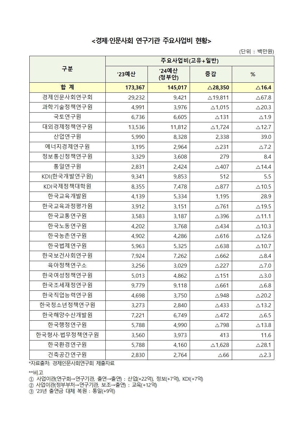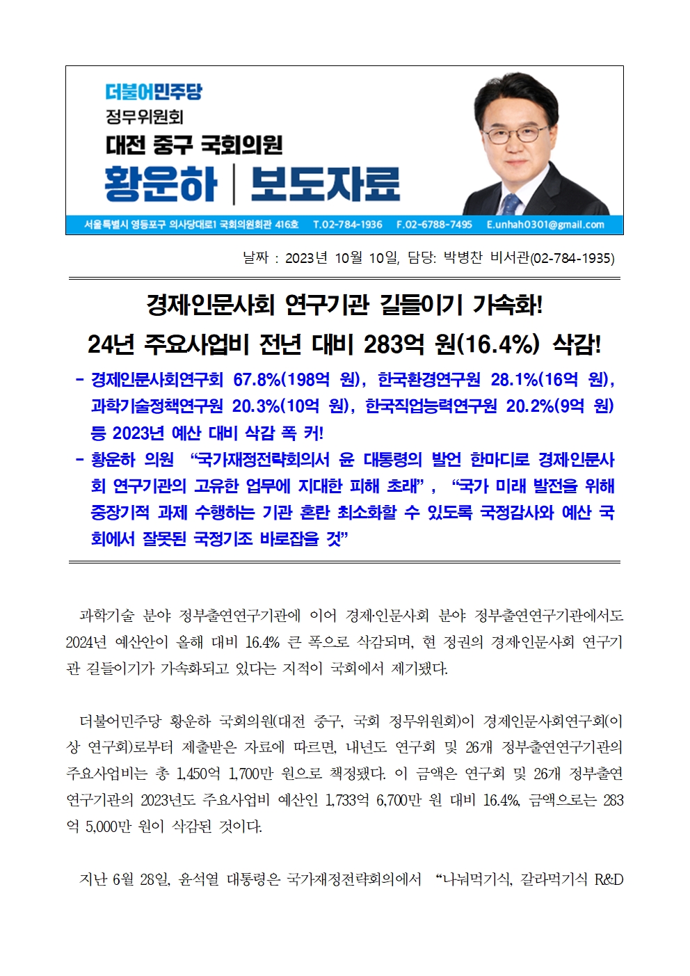 [황운하의원 보도자료] 경제‧인문사회 연구기관 길들이기 가속화! 24년 주요사업비 전년 대비 283억 원(16.4%) 삭감!