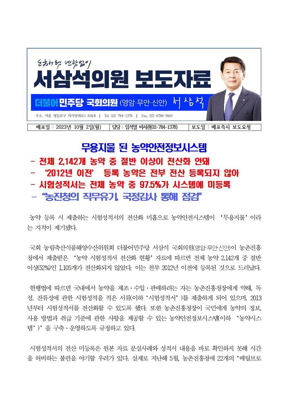 231002_[서삼석 국회의원] 농약시험성적서 농약안전시스템에 97.5% 미등록.hwp