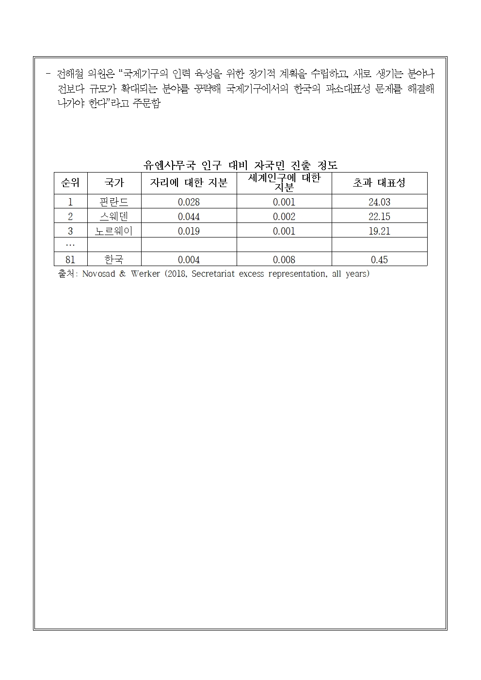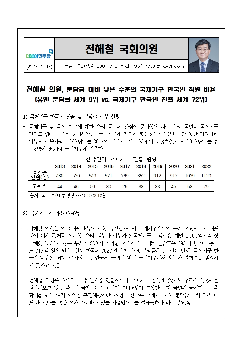 [전해철의원 국정감사 보도자료] 분담금 대비 낮은 수준의 국제기구 한국인 직원 비율