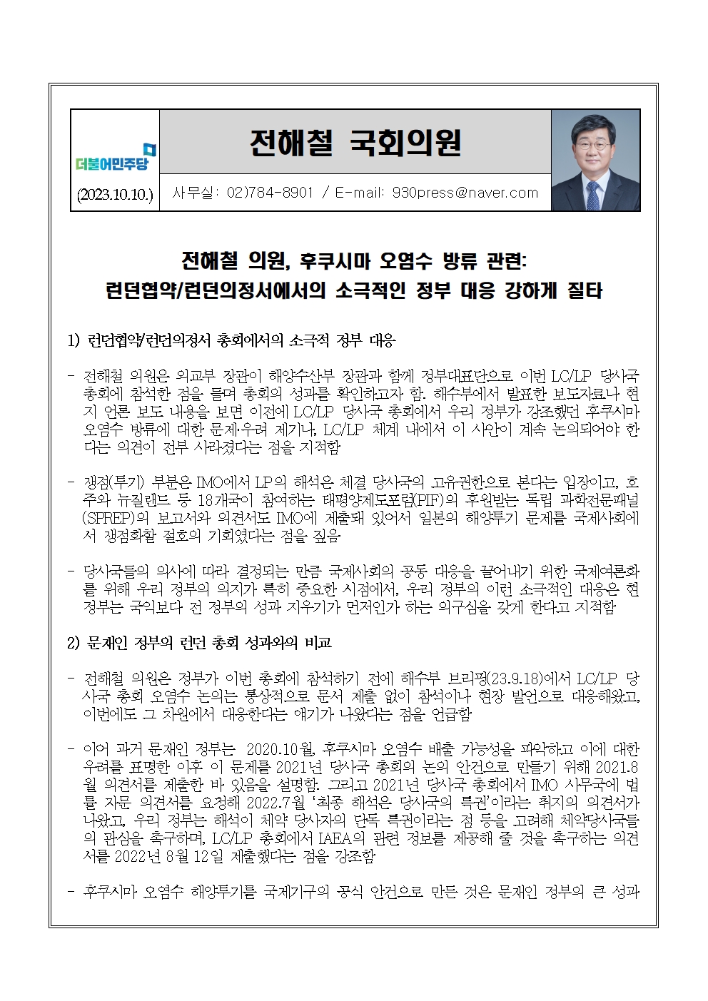 [전해철의원 국정감사 보도자료] 후쿠시마 오염수 방류 관련