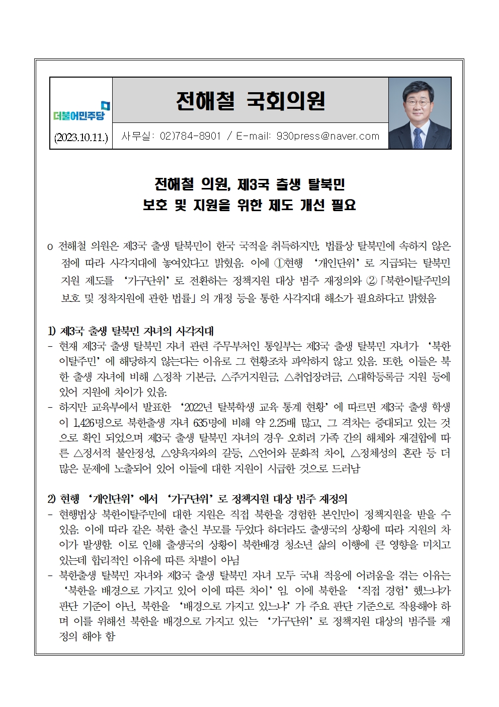 [전해철의원 국정감사 보도자료] 제3국 출생 탈북민 보호 및 지원을 위한 제도 개선 필요