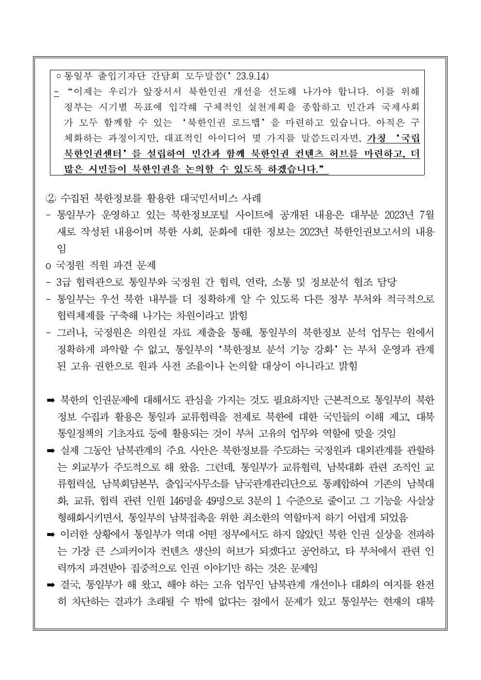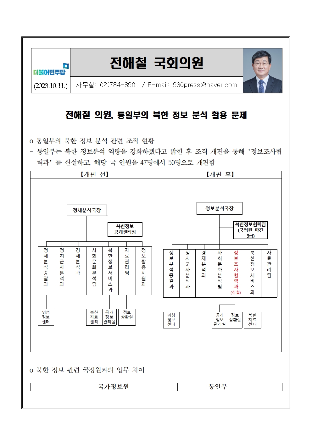 [전해철의원 국정감사 보도자료] 통일부의 북한 정보 분석 활용 문제