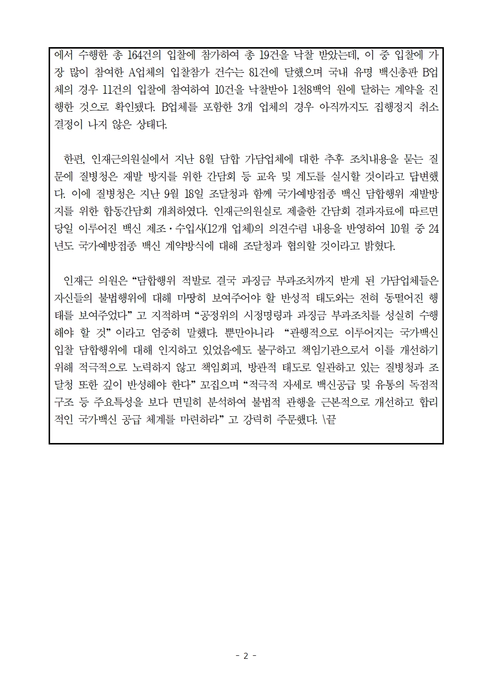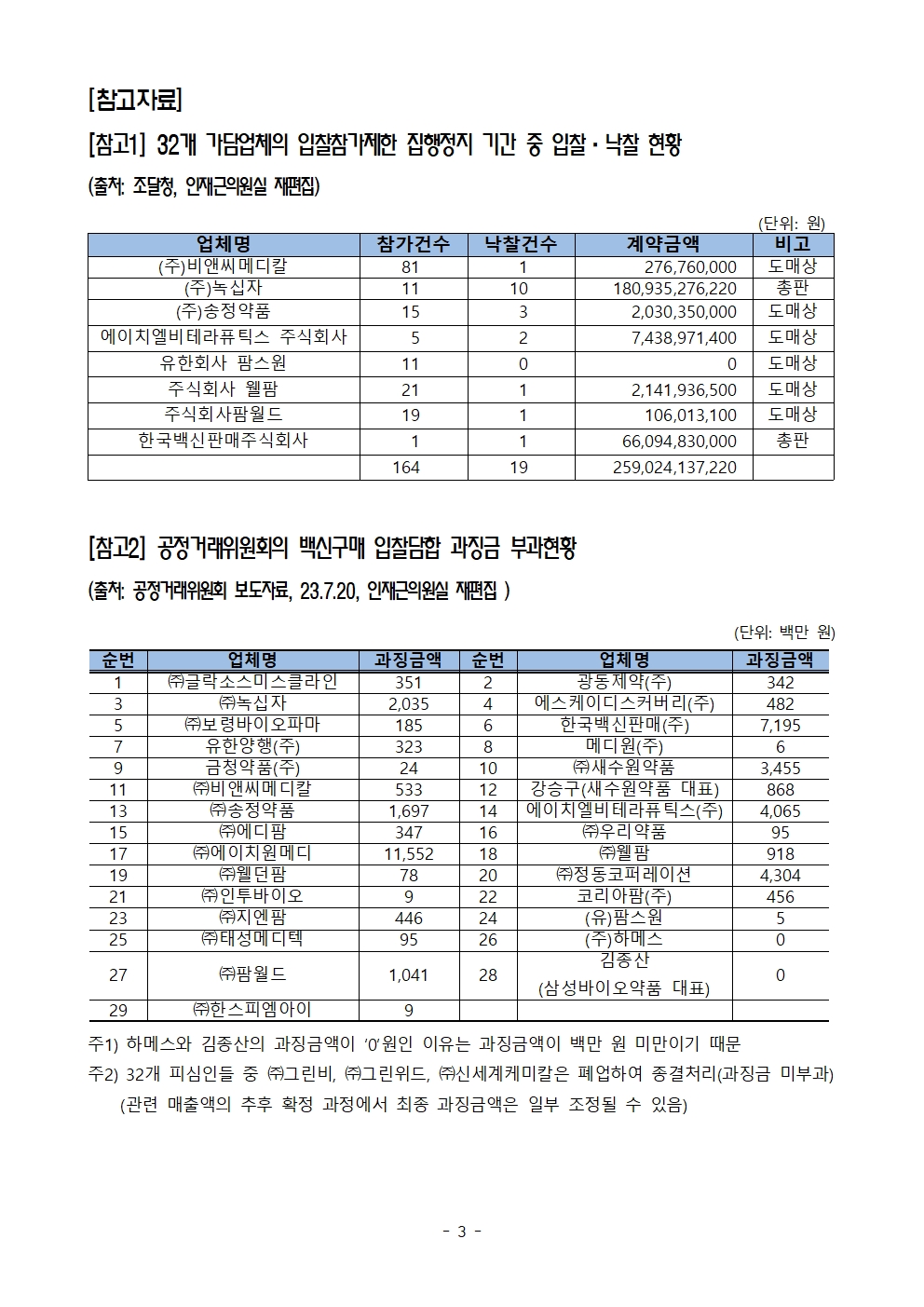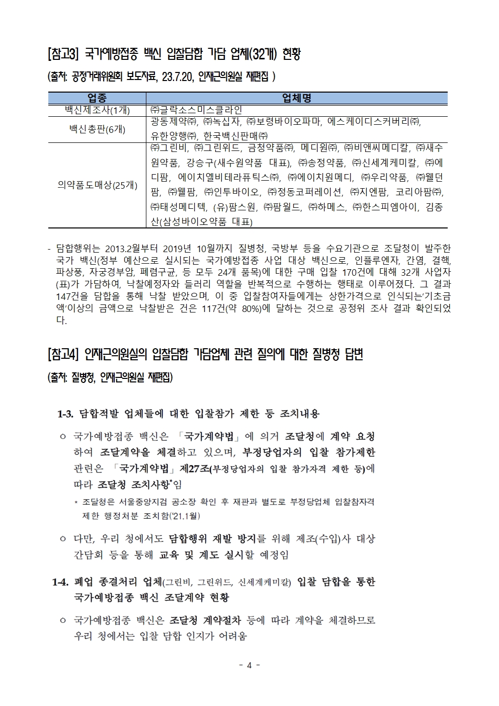 [인재근의원실 보도자료] 국가예방접종 백신구매 입찰담합 제재받은 8개 업체 제재 정지처분 통해 2천6백억 원에 달하는 조달계약 진행