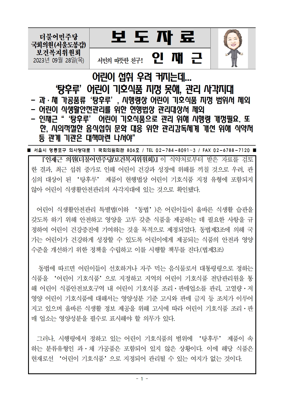 230928_[인재근의원실 보도자료] ‘탕후루’ 어린이 기호식품 지정 못해_ 관리 사각지대.hwp