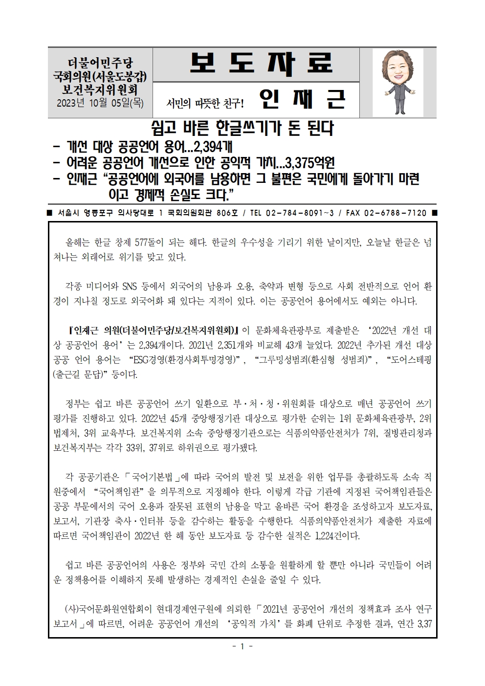 231005_[인재근의원실 보도자료] 쉽고 바른 한글쓰기가 돈 된다.hwp