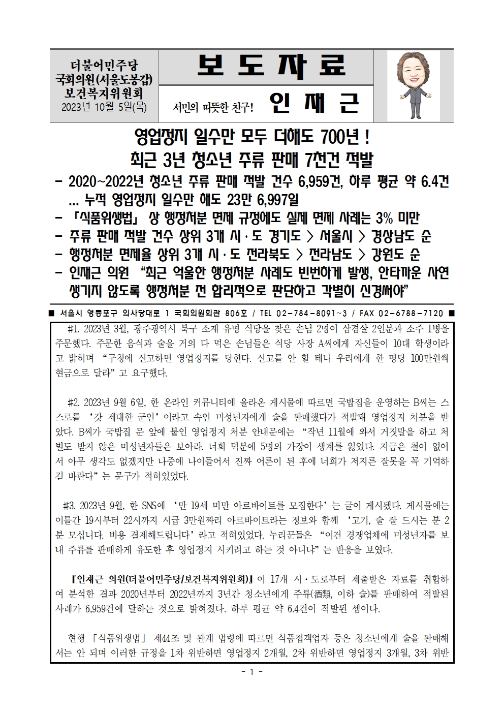 231005_[인재근의원실 보도자료] 영업정지 일수만 모두 더해도 700년_ 청소년 주류 판매 7천건 적발.hwp