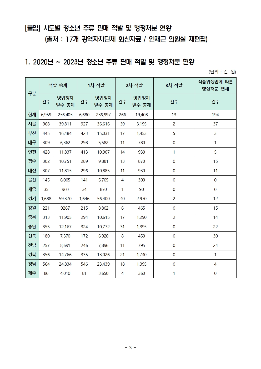 [인재근의원실 보도자료] 영업정지 일수만 모두 더해도 700년 ! 최근 3년 청소년 주류 판매 7천건 적발