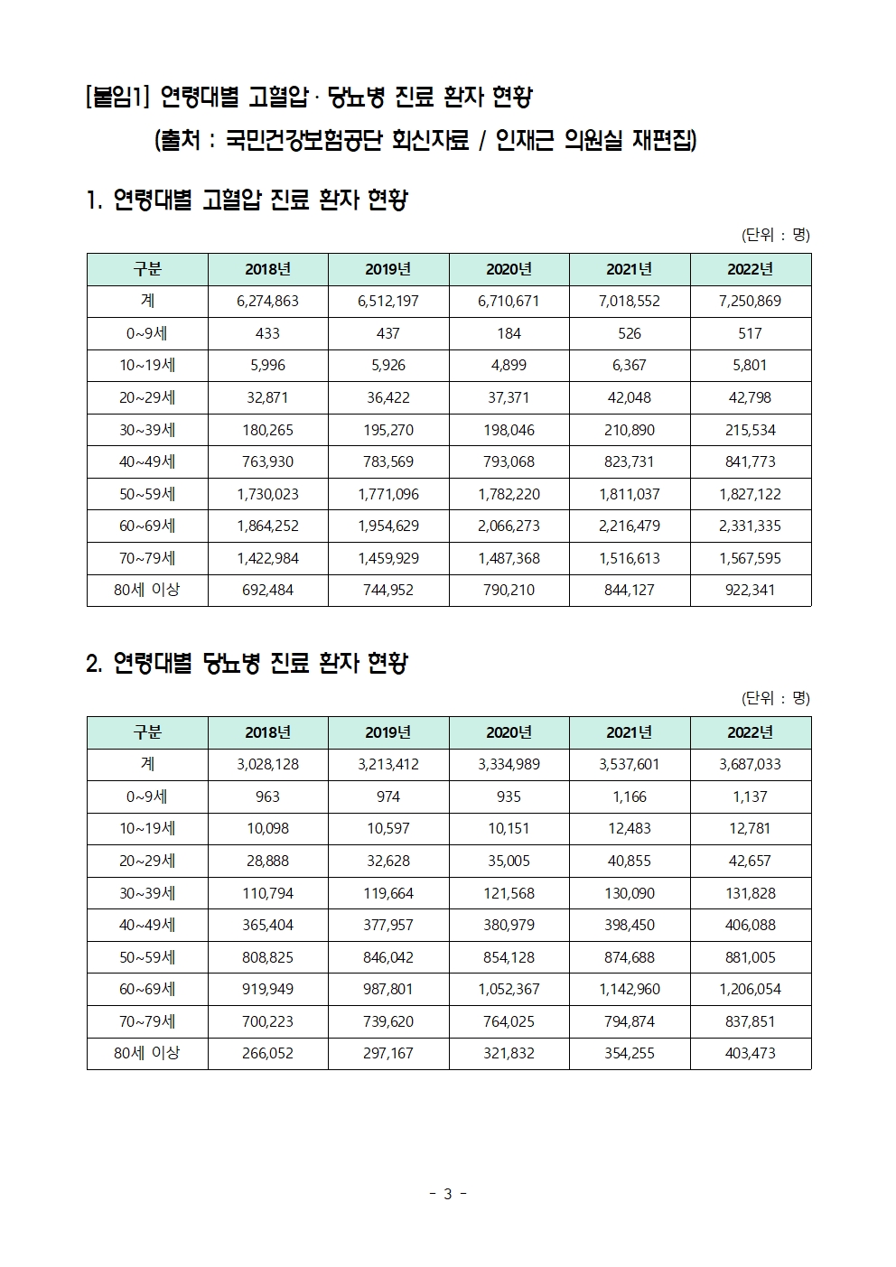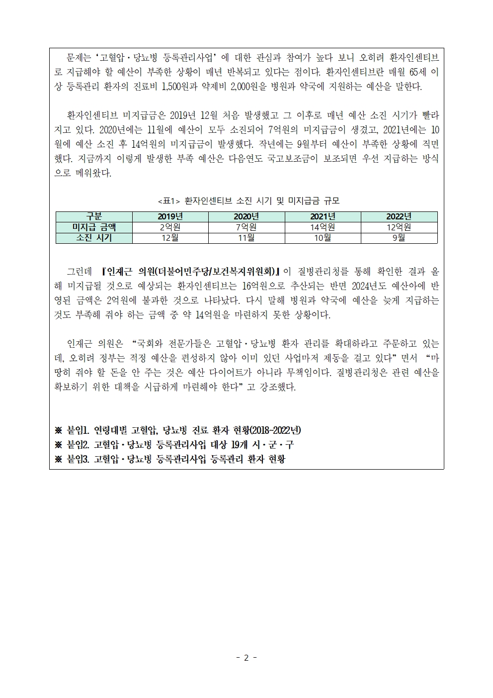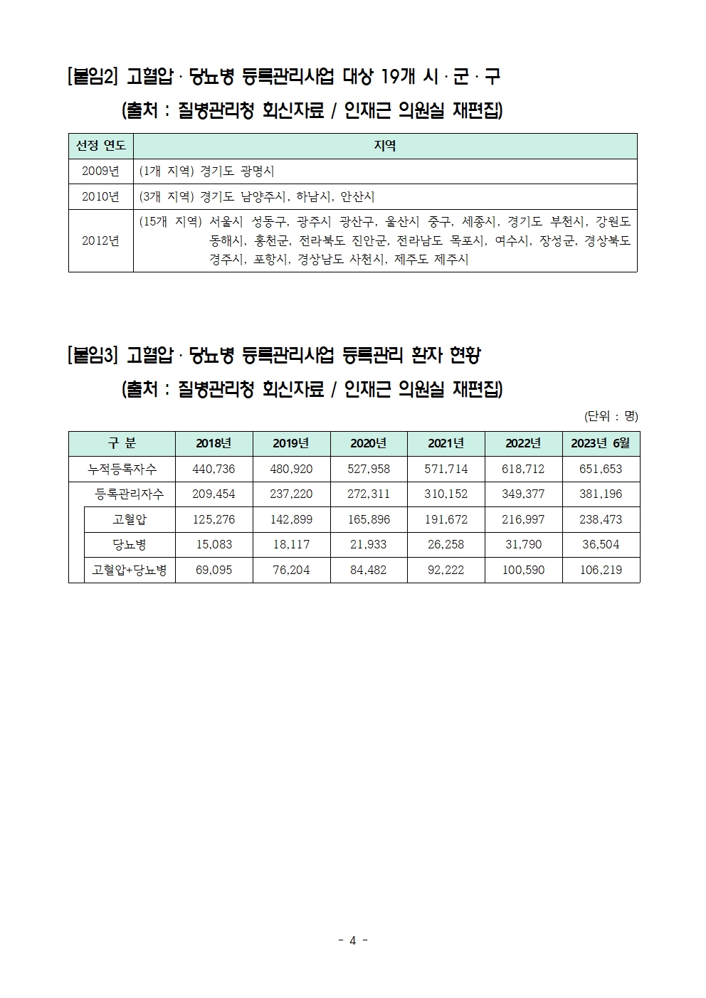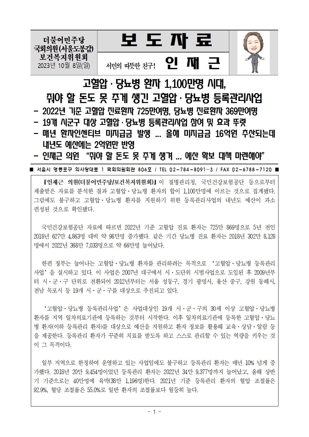 [인재근의원실 보도자료] 고혈압·당뇨병 환자 1,100만명 시대, 줘야 할 돈도 못 주게 생긴 고혈압·당뇨병 등록관리사업