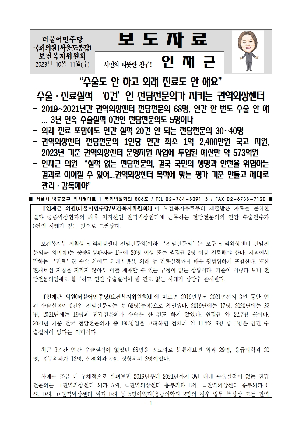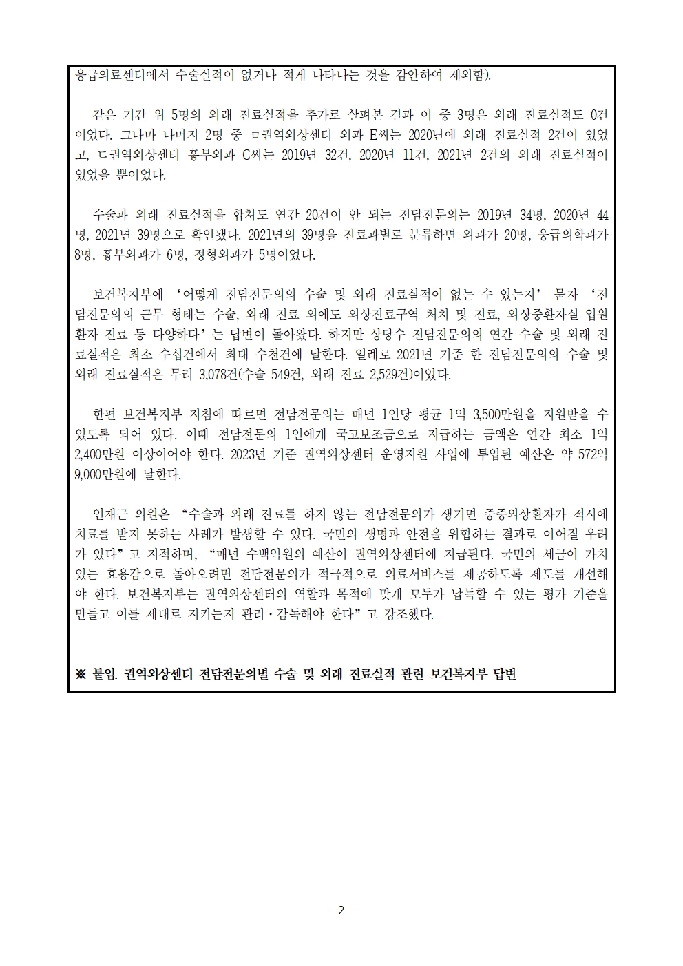 [인재근의원실 보도자료] “수술도 안 하고 외래 진료도 안 해요” 수술·진료실적 ‘0건’인 전담전문의가 지키는 권역외상센터 최다