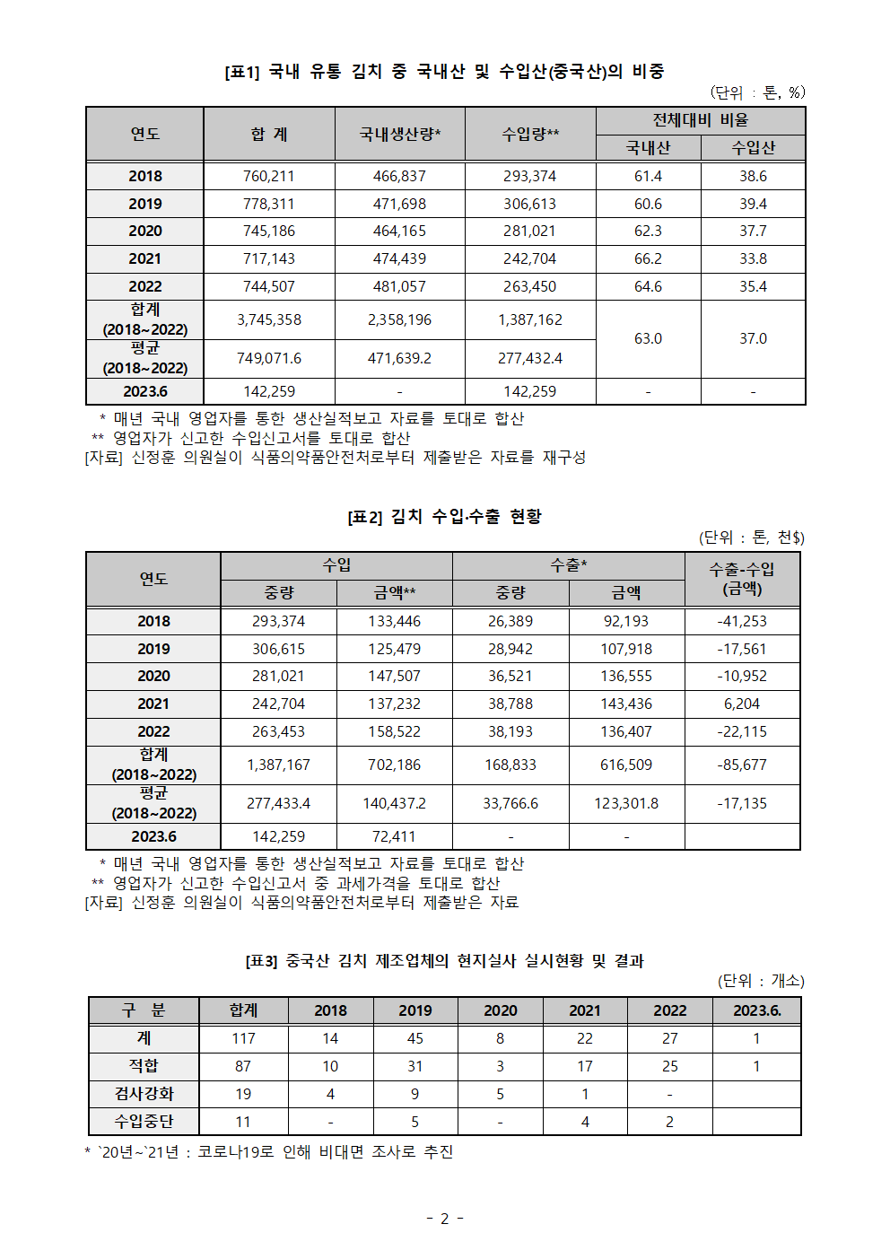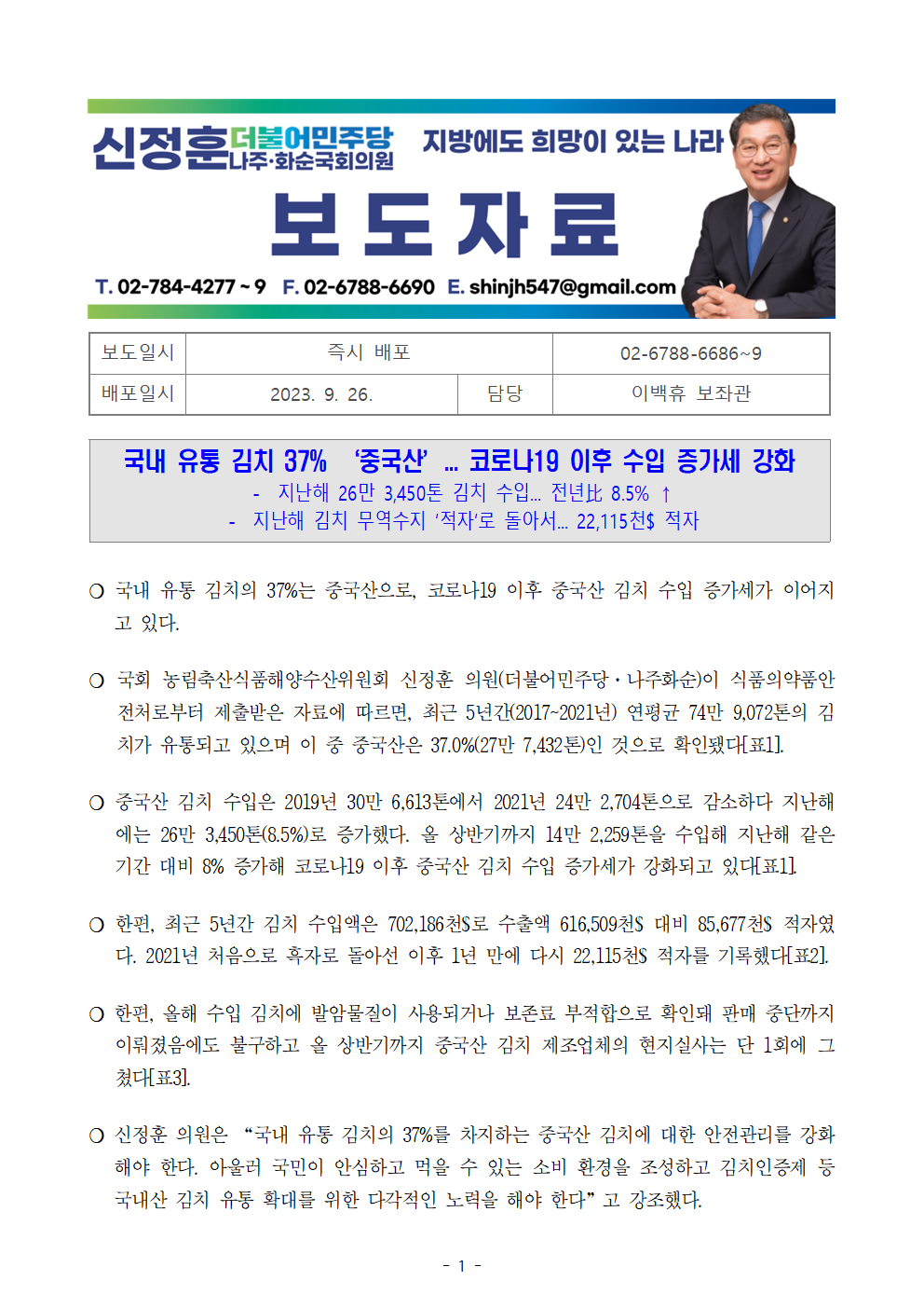 [신정훈 의원 보도자료] 국내 유통 김치 37% ‘중국산’... 코로나19 이후 수입 증가세 강화
