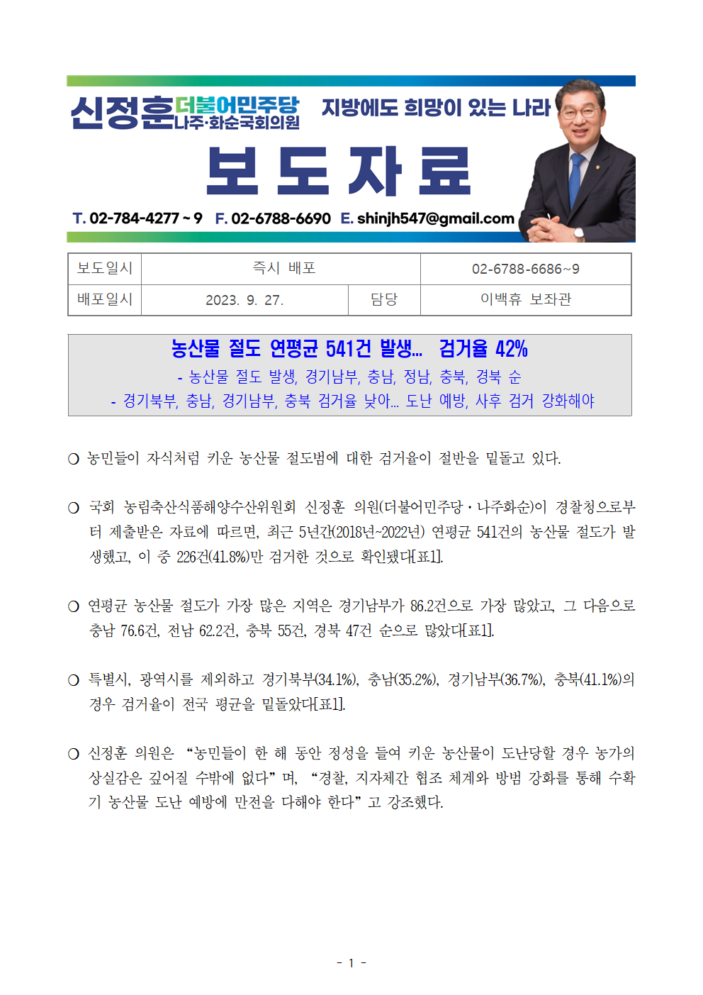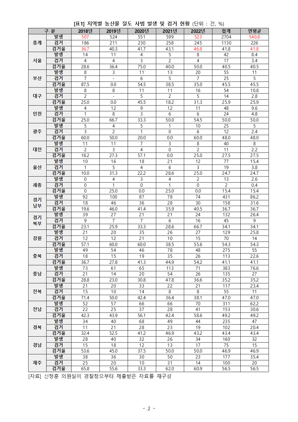 [신정훈 의원 보도자료] 농산물 절도 연평균 541건 발생... 검거율 42%