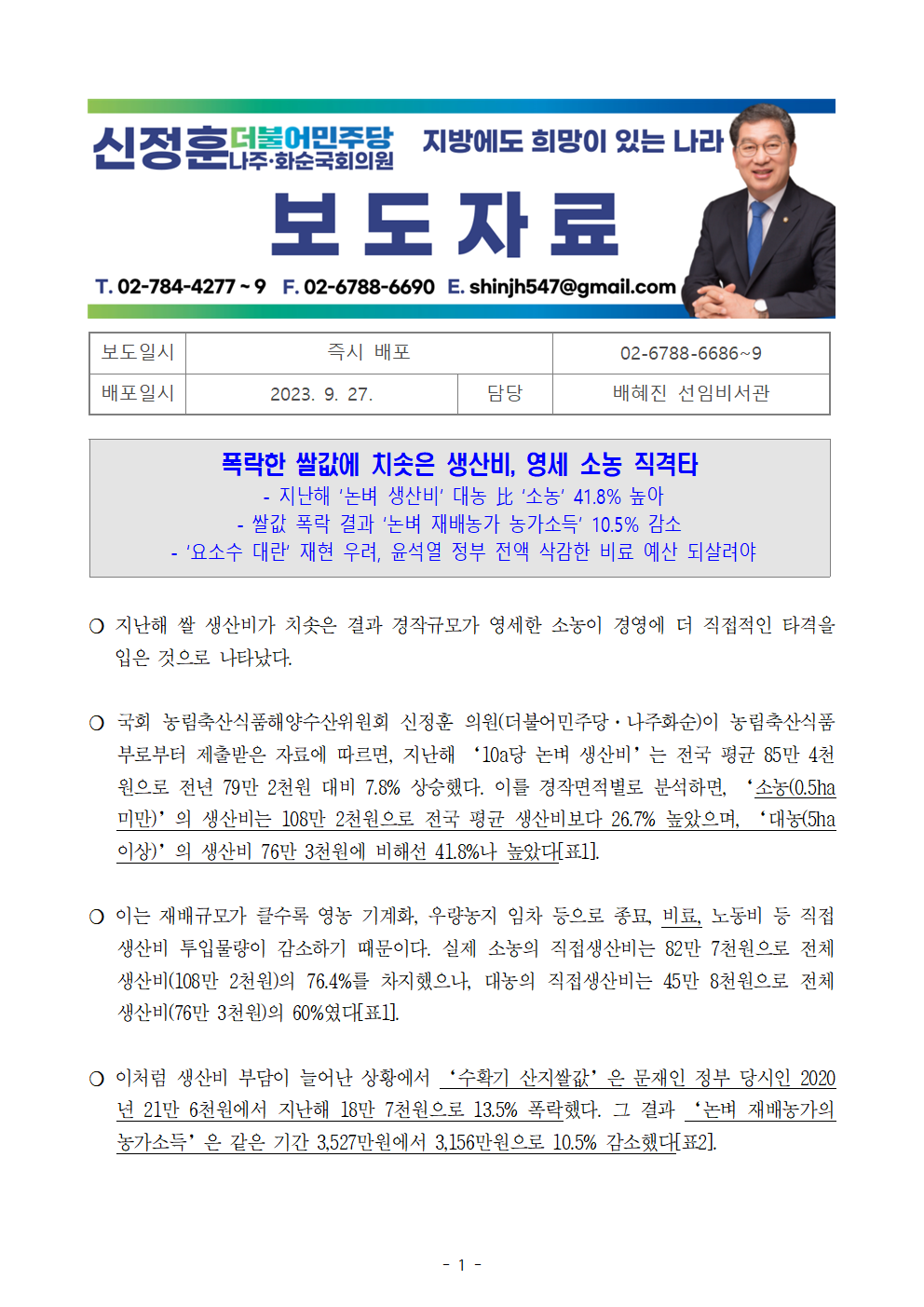 [신정훈 의원 보도자료] 폭락한 쌀값에 치솟은 생산비, 영세 소농 직격타