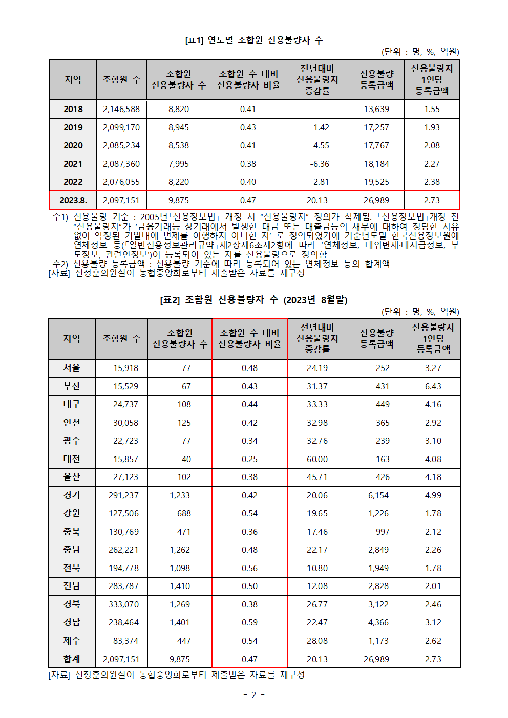 [신정훈 의원 보도자료] 농협 조합원 중 신용불량자 급증... 농가 소득 안정화 절실