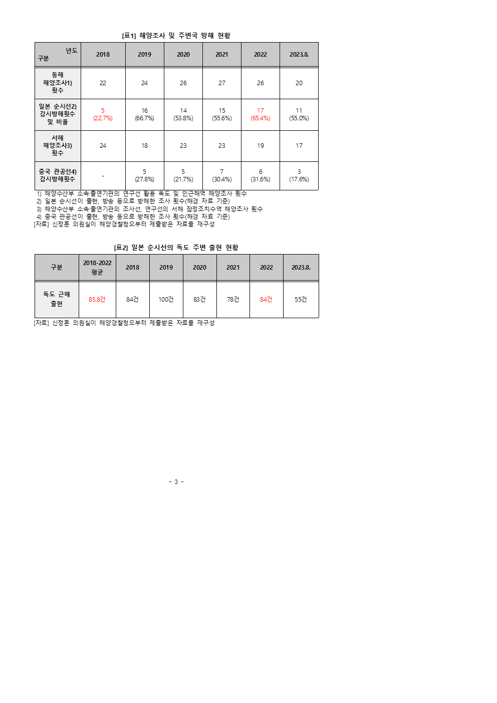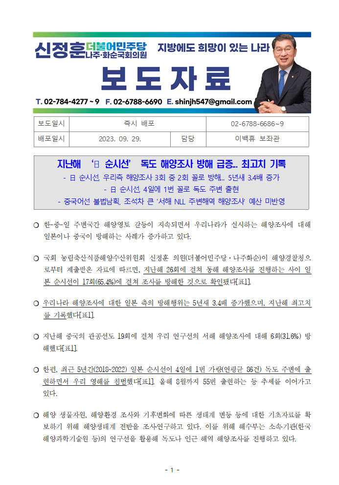[신정훈 의원 보도자료] 지난해 ‘日 순시선’ 독도 해양조사 방해 급증... 최고치 기록
