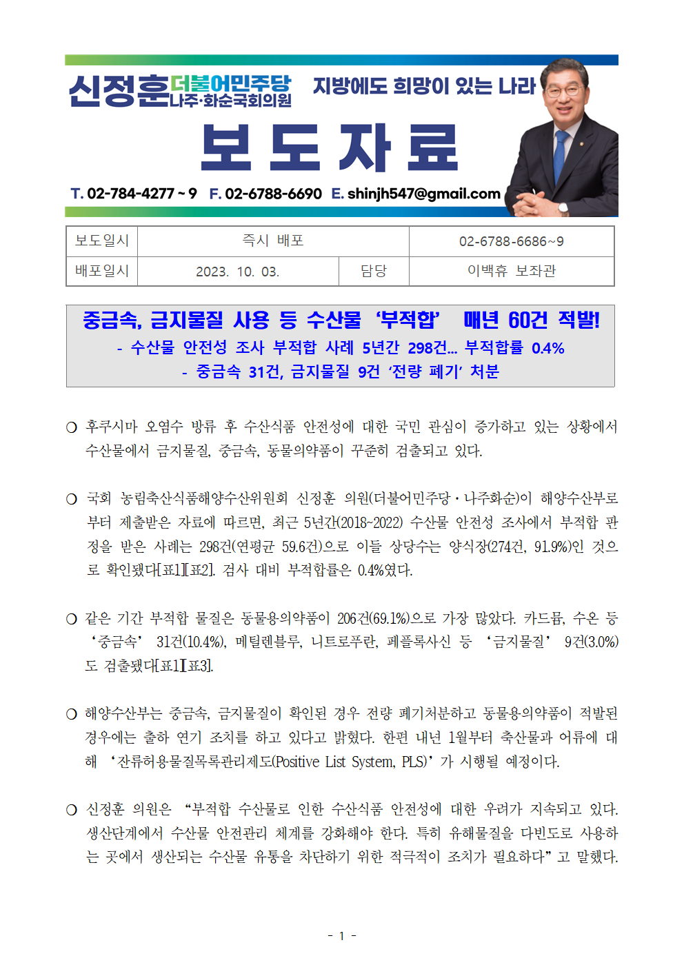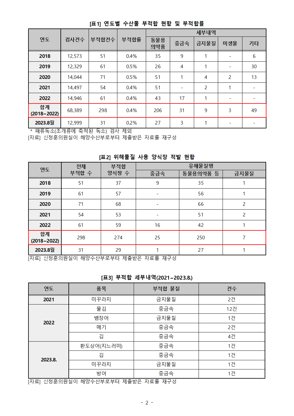 [신정훈 의원 보도자료] 중금속, 금지물질 사용 등 수산물‘부적합’ 매년 60건 적발!