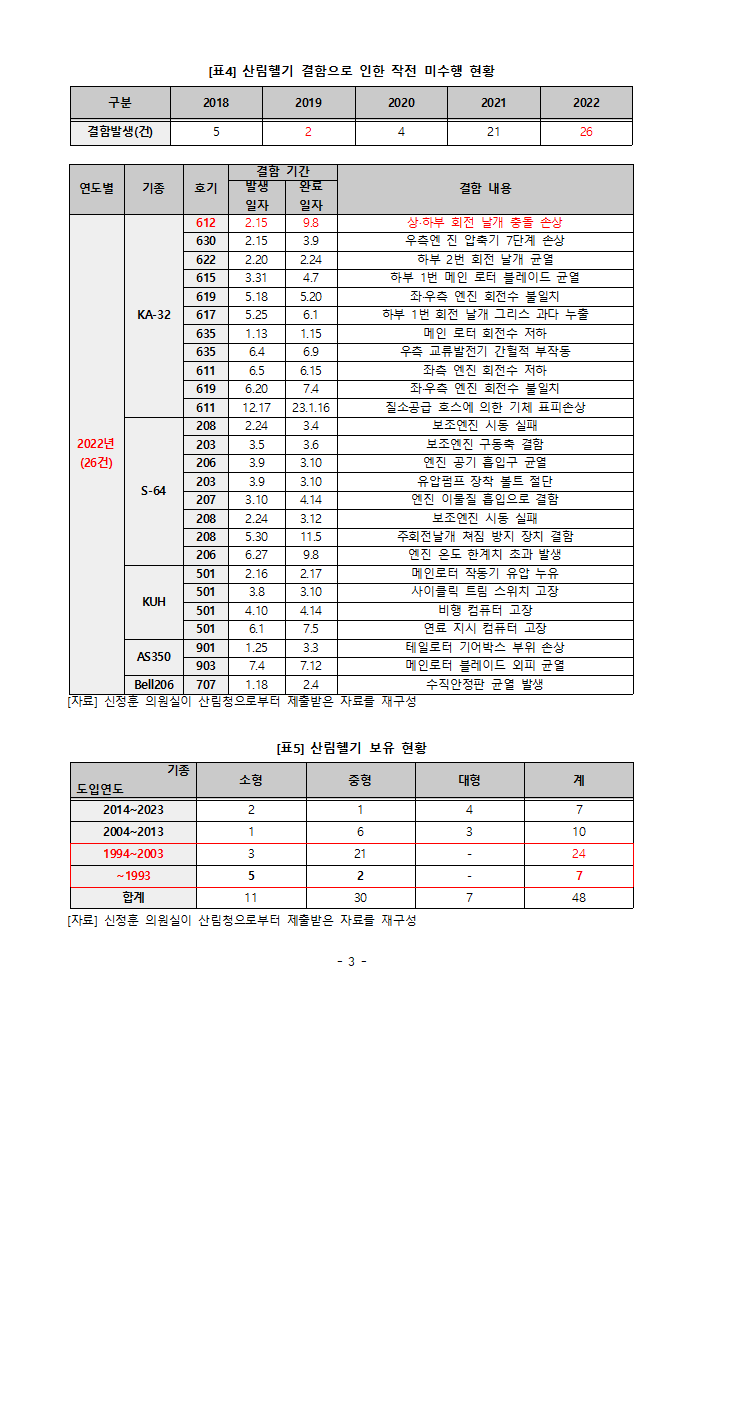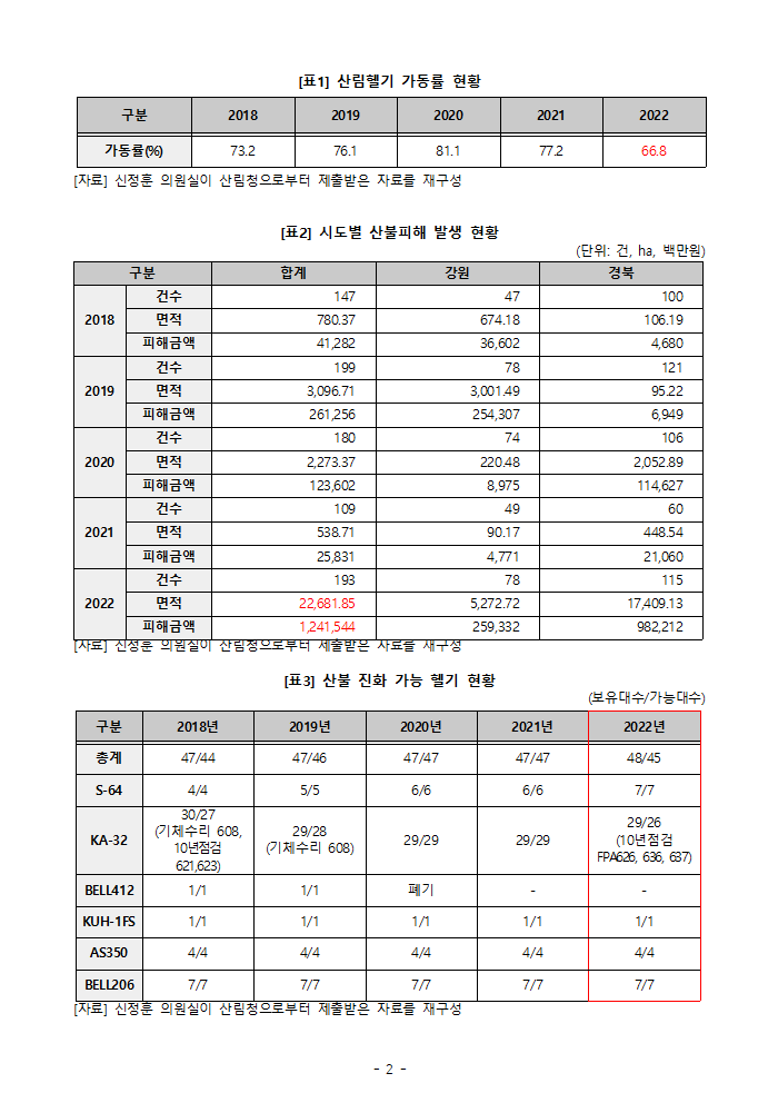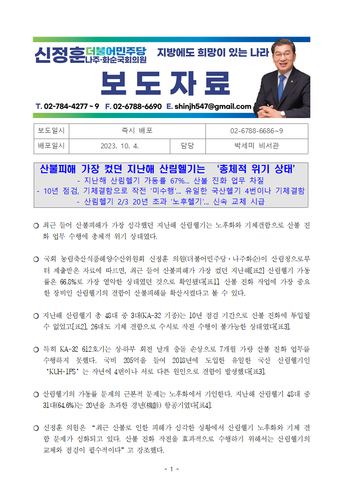 [신정훈 의원 보도자료] 산불피해 가장 컸던 지난해 산림헬기는 ‘총체적 위기 상태’