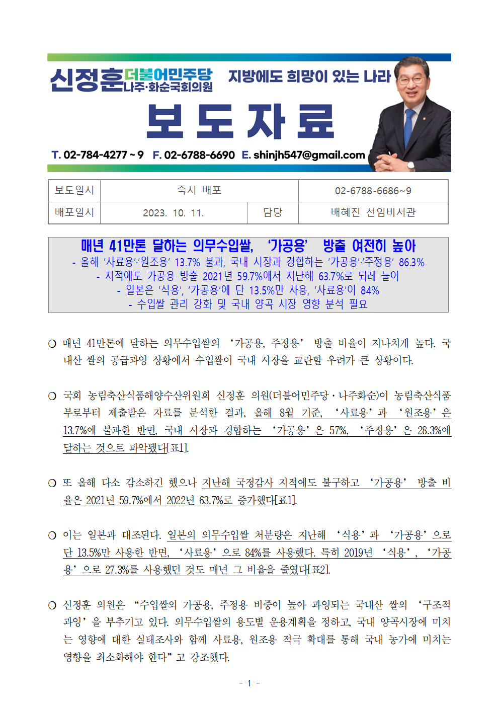 [신정훈 의원 보도자료] 매년 41만톤 달하는 의무수입쌀, ‘가공용’ 방출 여전히 높아