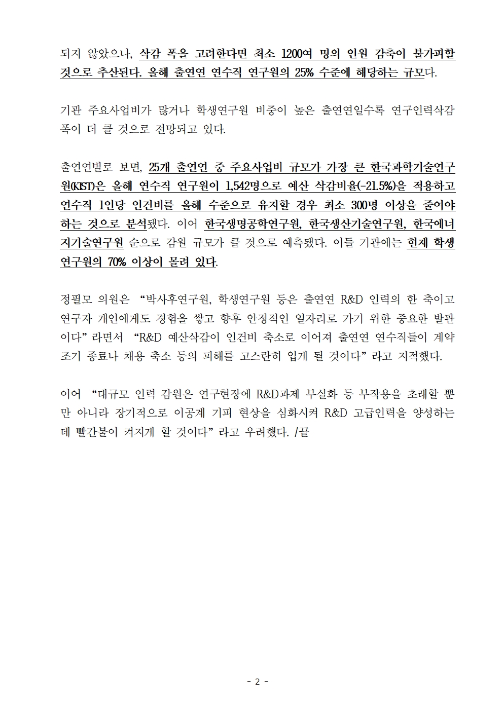 [정필모 의원 보도자료] 정부 출연연 R&D 예산삭감 후폭풍 :“포닥·학생연구원 등 1200여 명 이상 사라질 위기”
