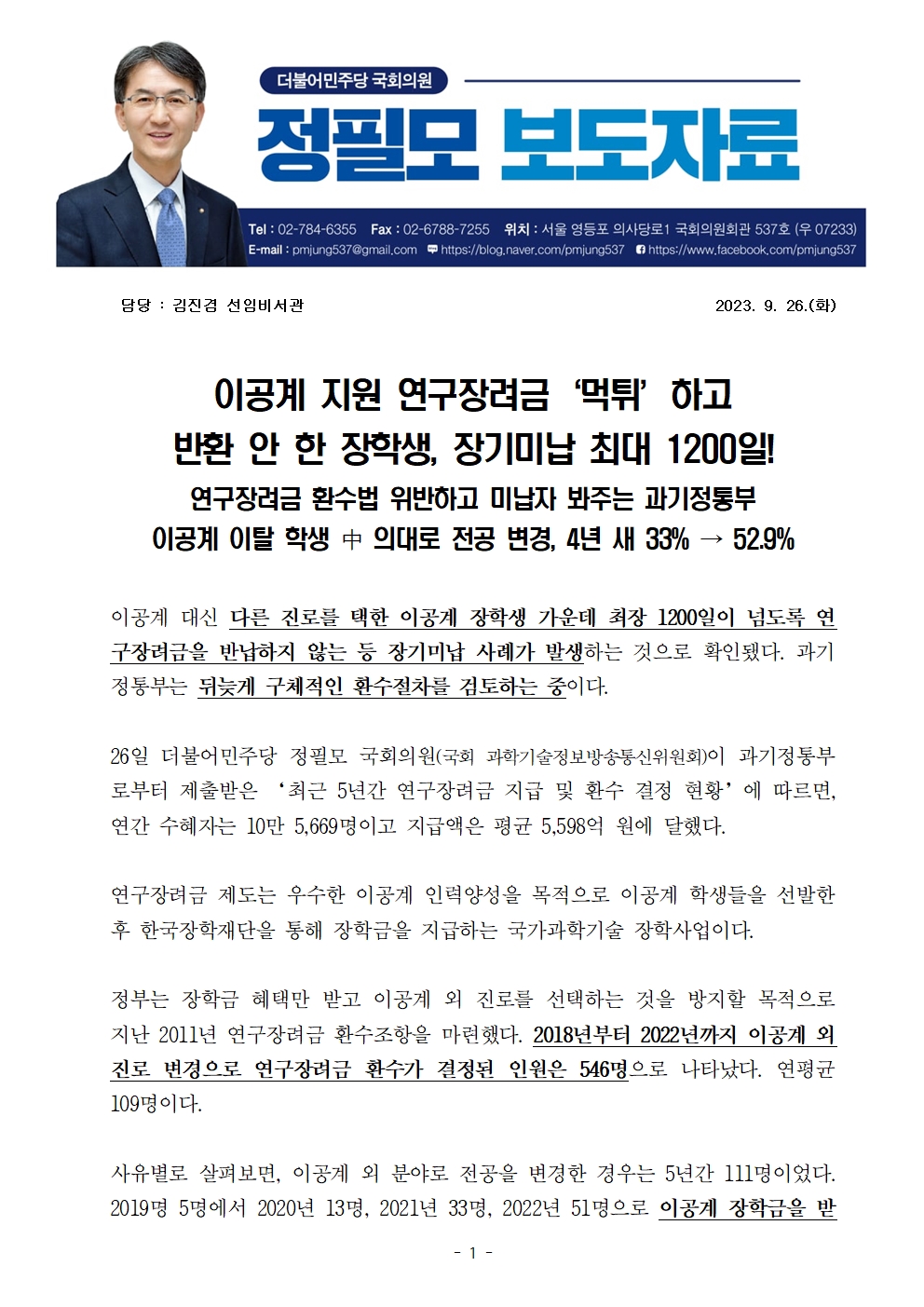 [정필모 의원 보도자료] 이공계 지원 연구장려금‘먹튀’하고 반환 안 한 장학생, 장기미납 최대 1200일!