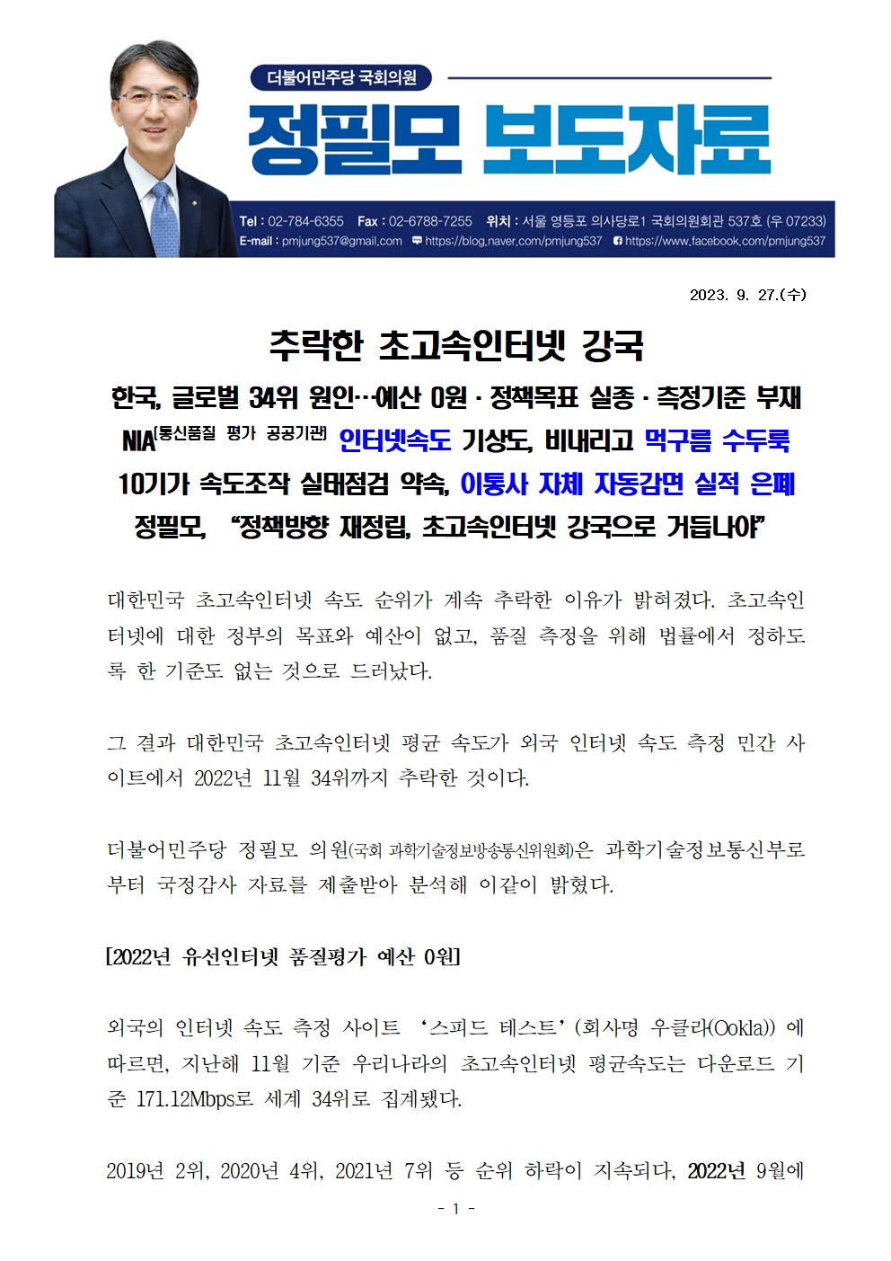 [정필모 의원 보도자료] 추락한 초고속인터넷 강국