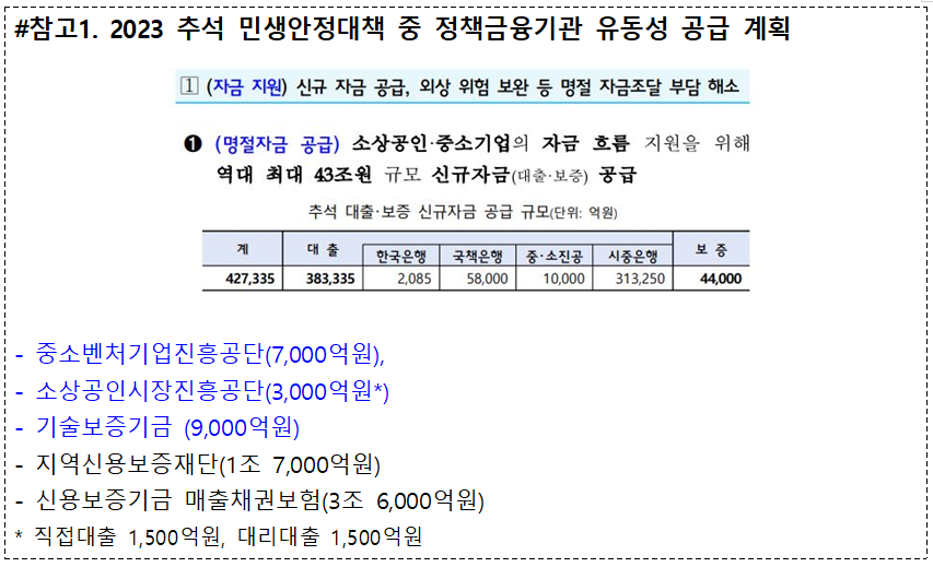 정부는 올해 추석 민생안정 대책의 일환으로 소상공인·중소기업의 자금 흐름 지원을 위해 명절 전후로 역대 최대인 43조원 규모의 신규자금(대출·보증)을 공급하겠다 밝혔다.