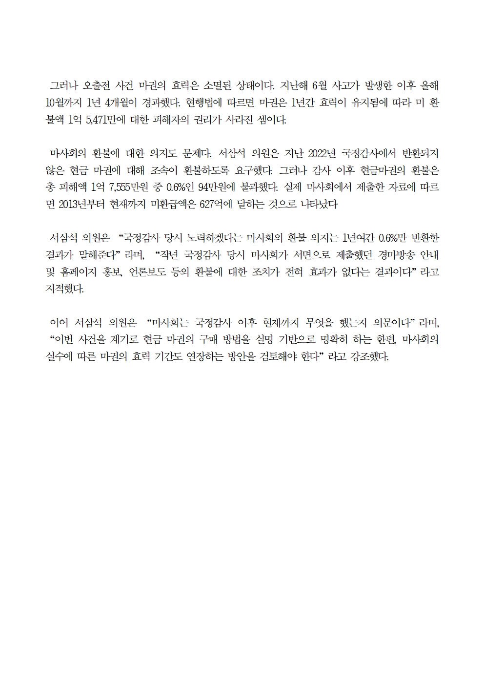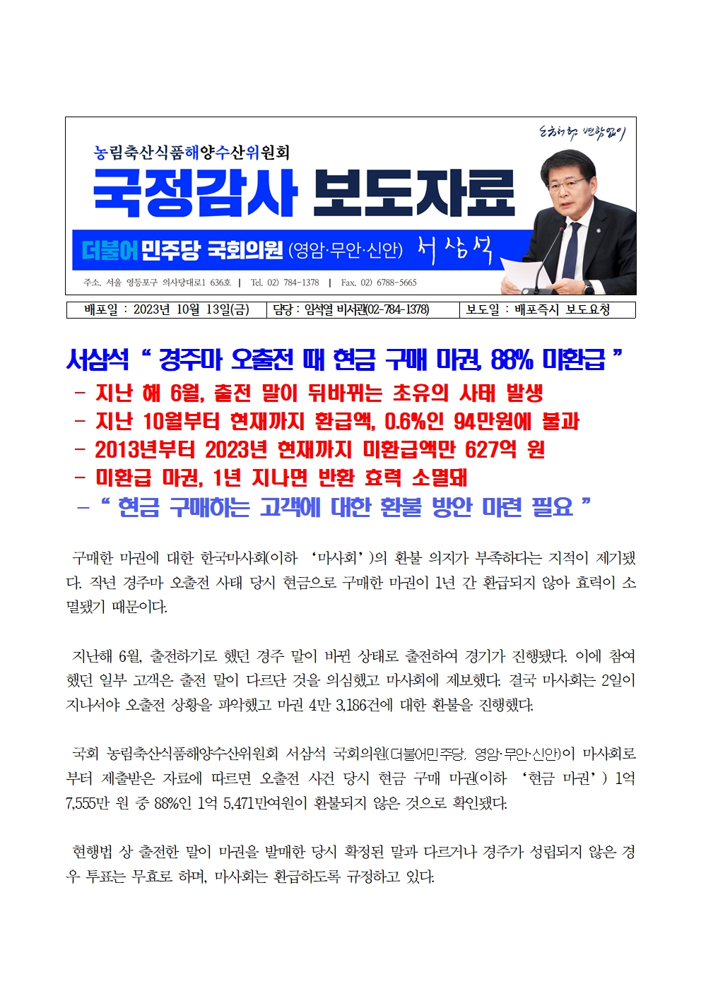 231013_[서삼석 국회의원] 서삼석“ 경주마 오출전 때 현금 구매 마권 88% 미환급 ”.hwp