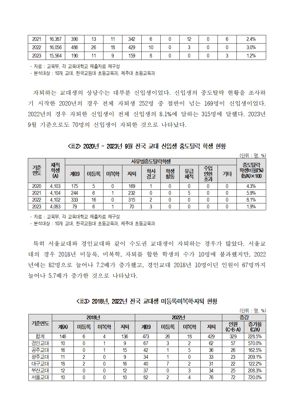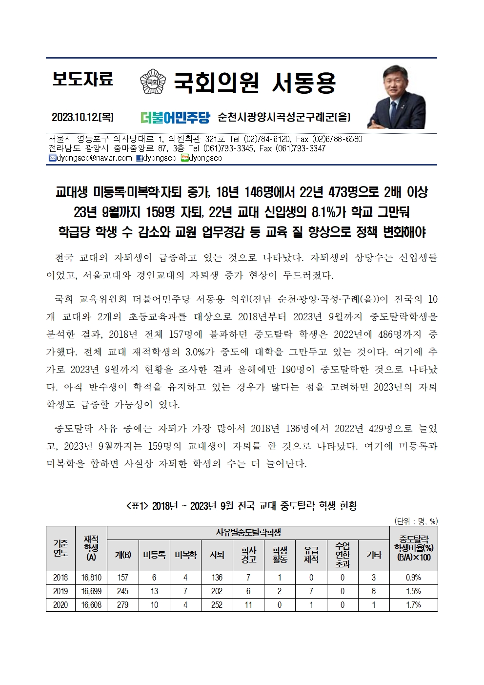 18. 231012_국감_서동용_교대생_미등록_미복학_자퇴_증가_18년_146명에서_22년_473명.hwp