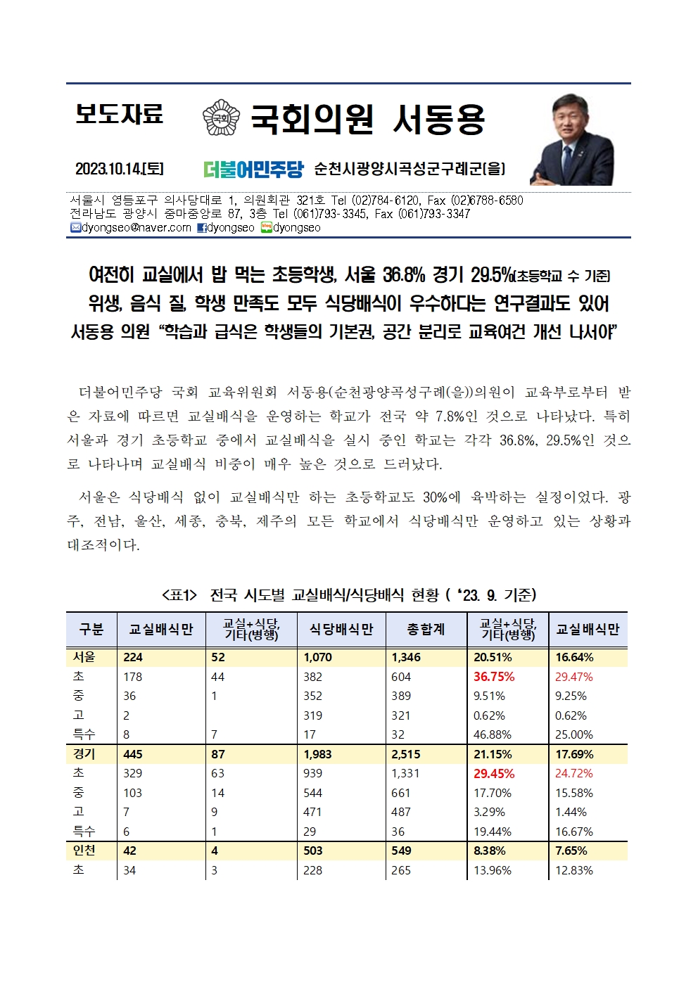 20. 231014_국감_서동용_교실서 급식먹는 서울경기 초등학교 31.7% 교육여건 개선 나서야.hwp