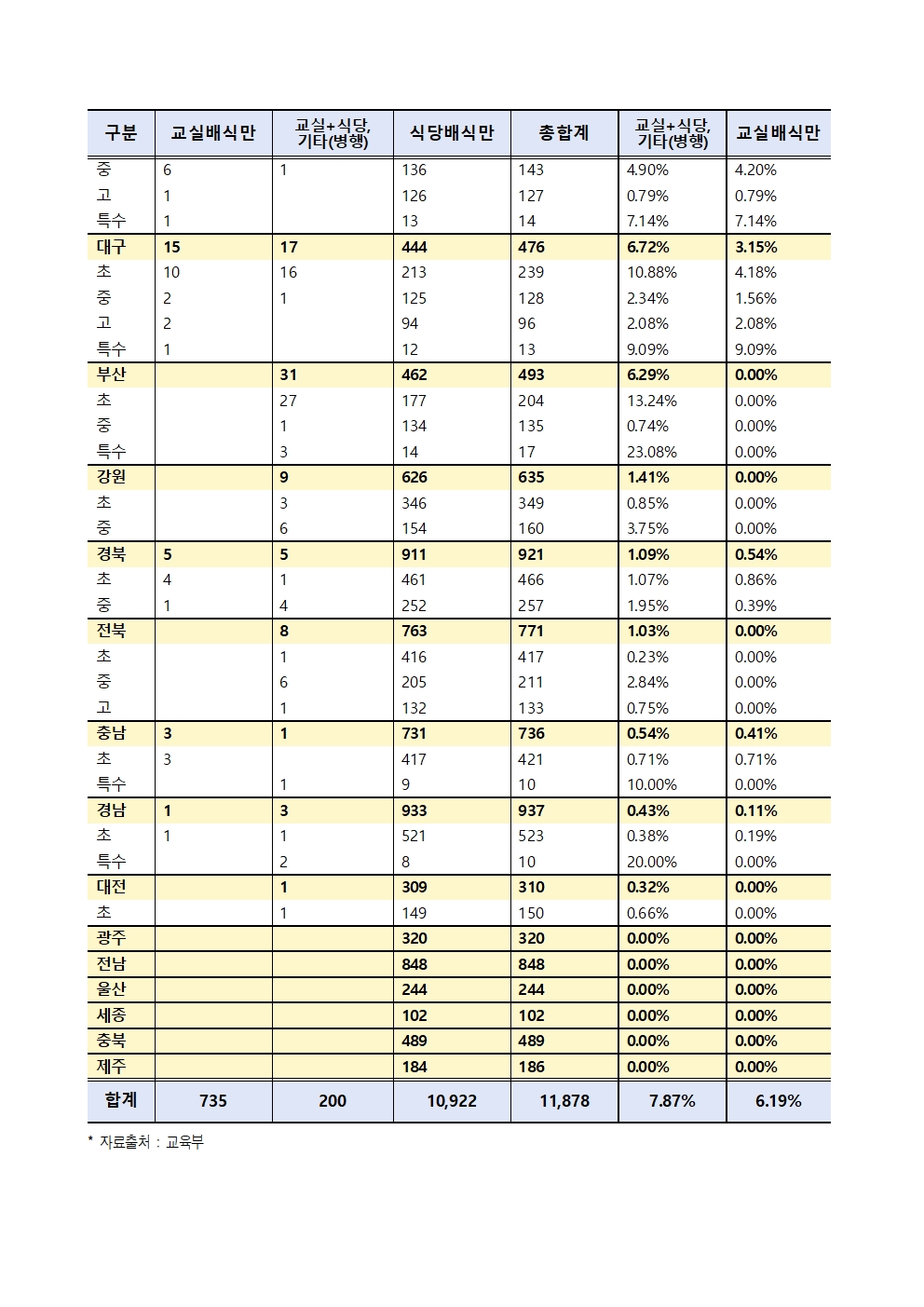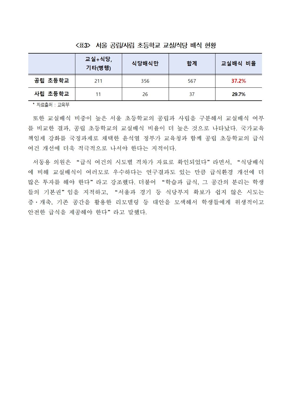 [서동용 의원] 여전히 교실에서 밥 먹는 초등학생, 서울 36.8% 경기 29.5%(초등학교 수 기준)