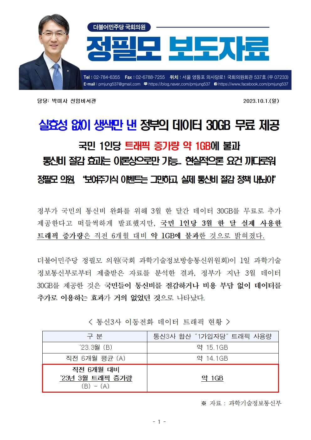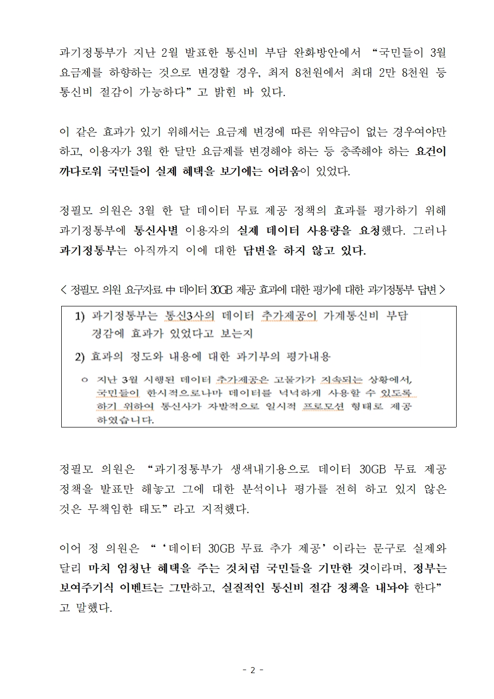 [정필모 의원 보도자료] 실효성 없이 생색만 낸 정부의 데이터 30GB 무료 제공