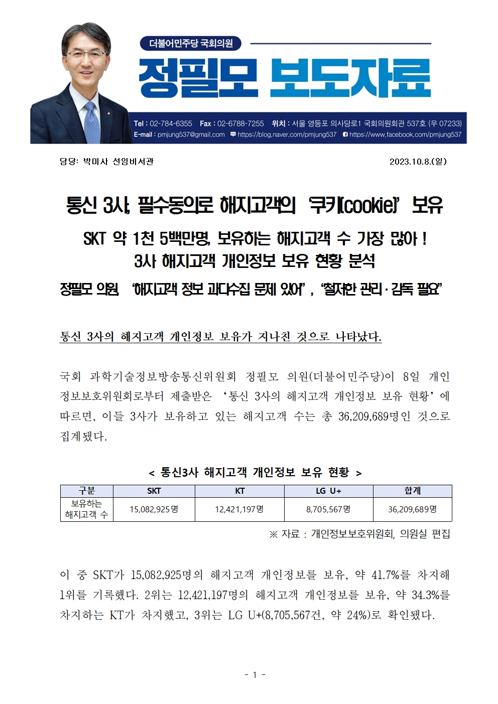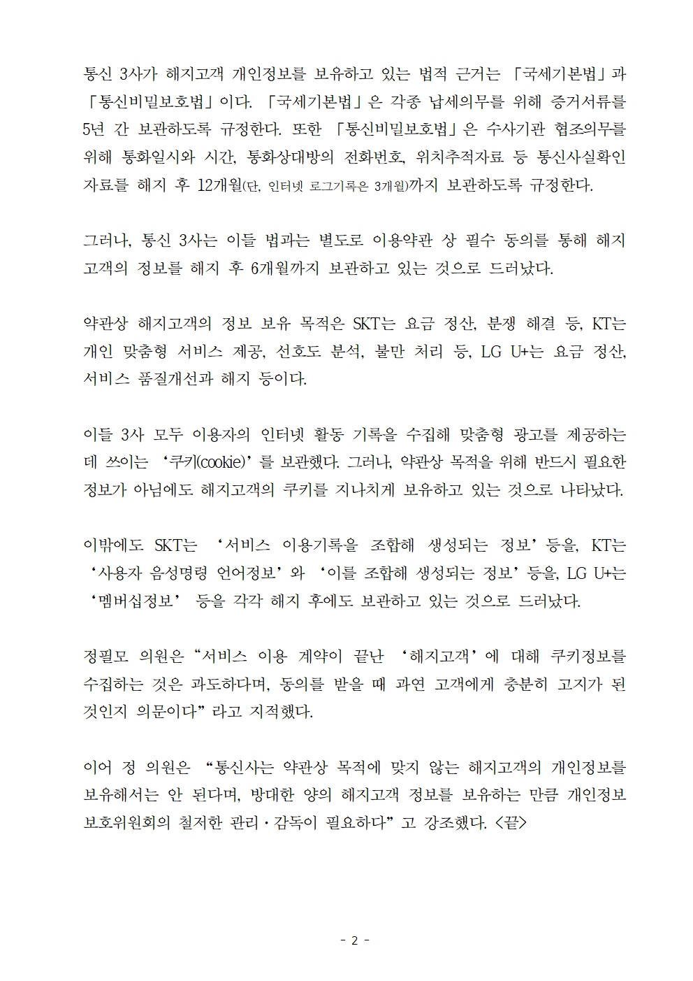 [정필모 의원 보도자료] 통신 3사, 필수동의로 해지고객의‘쿠키(cookie)’보유