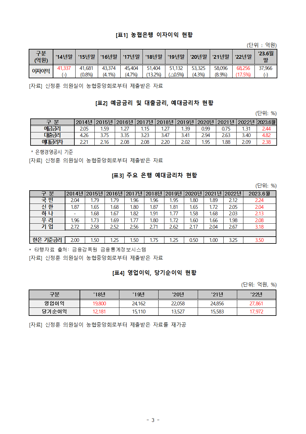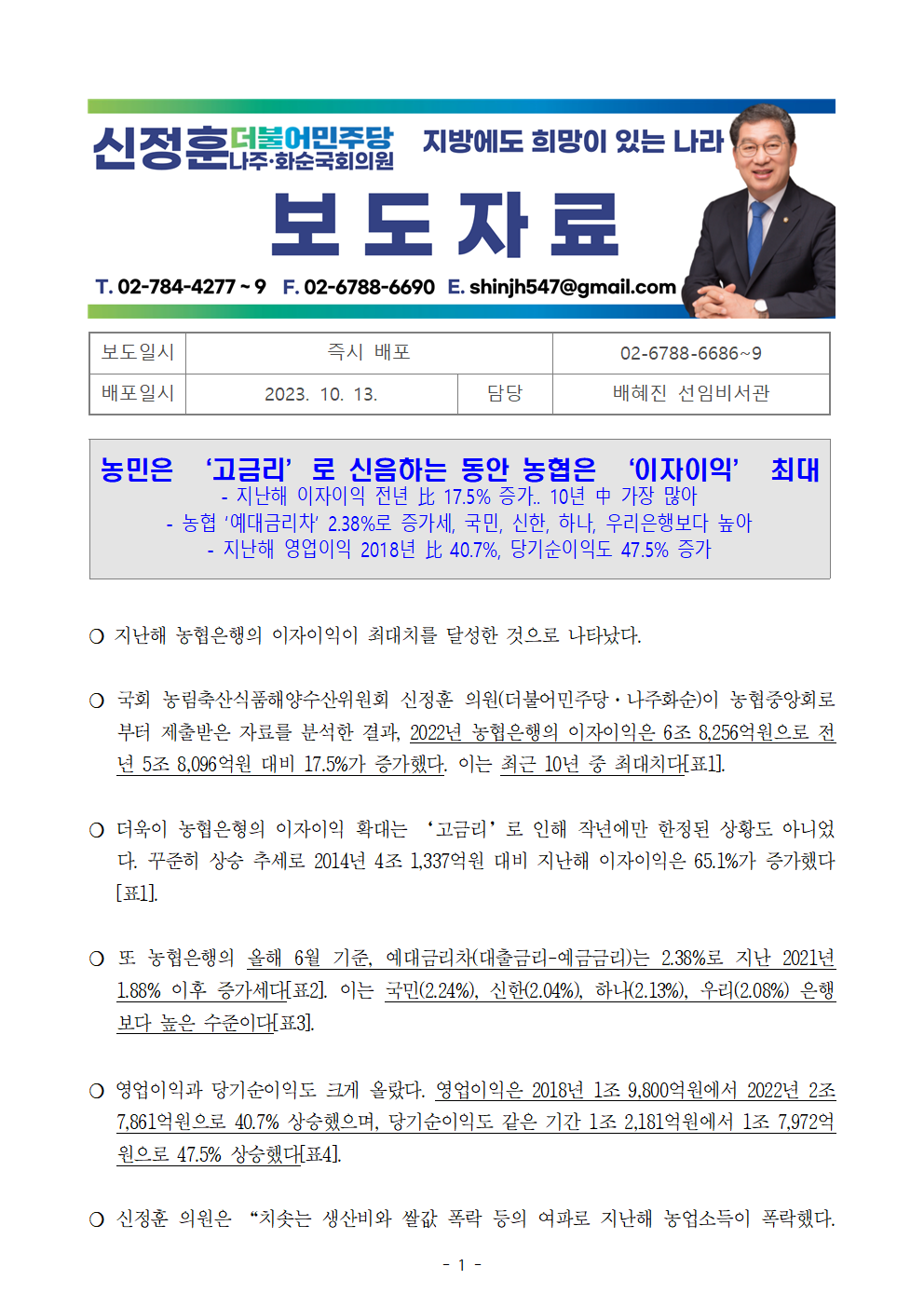 [신정훈 의원실 보도자료] 농민은 ‘고금리’로 신음하는 동안 농협은 ‘이자이익’ 최대