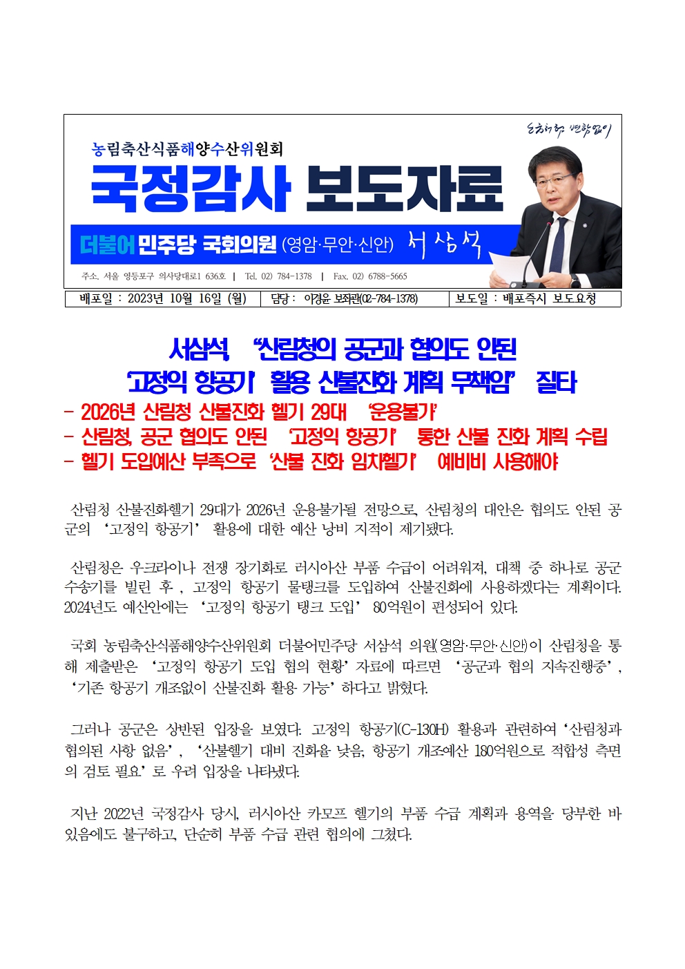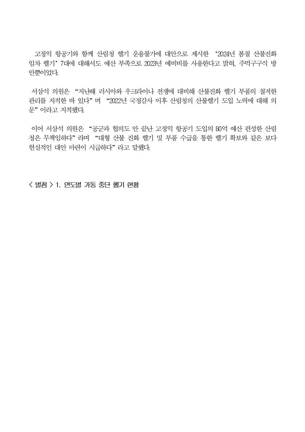 231016_[서삼석 국회의원] 서삼석 산림청의 “공군과 협의도 안된 ‘고정익 항공기’활용 산불진화 계획 무책임” 질타.hwp