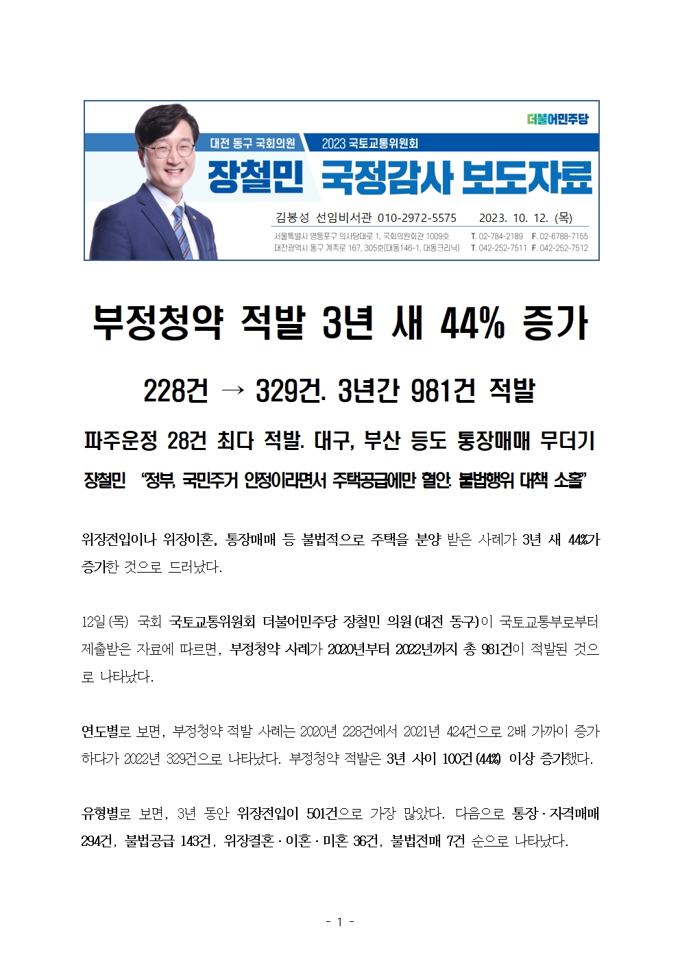 231012_장철민의원보도자료_부정청약_적발_3년_새_44%_증가.hwp