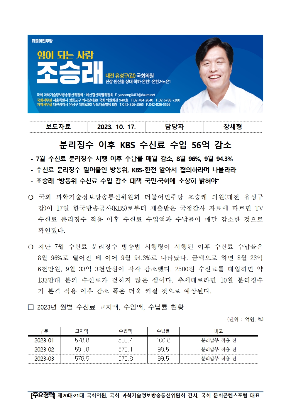[조승래의원 보도자료] 분리징수 이후 KBS 수신료 수입 56억 감소